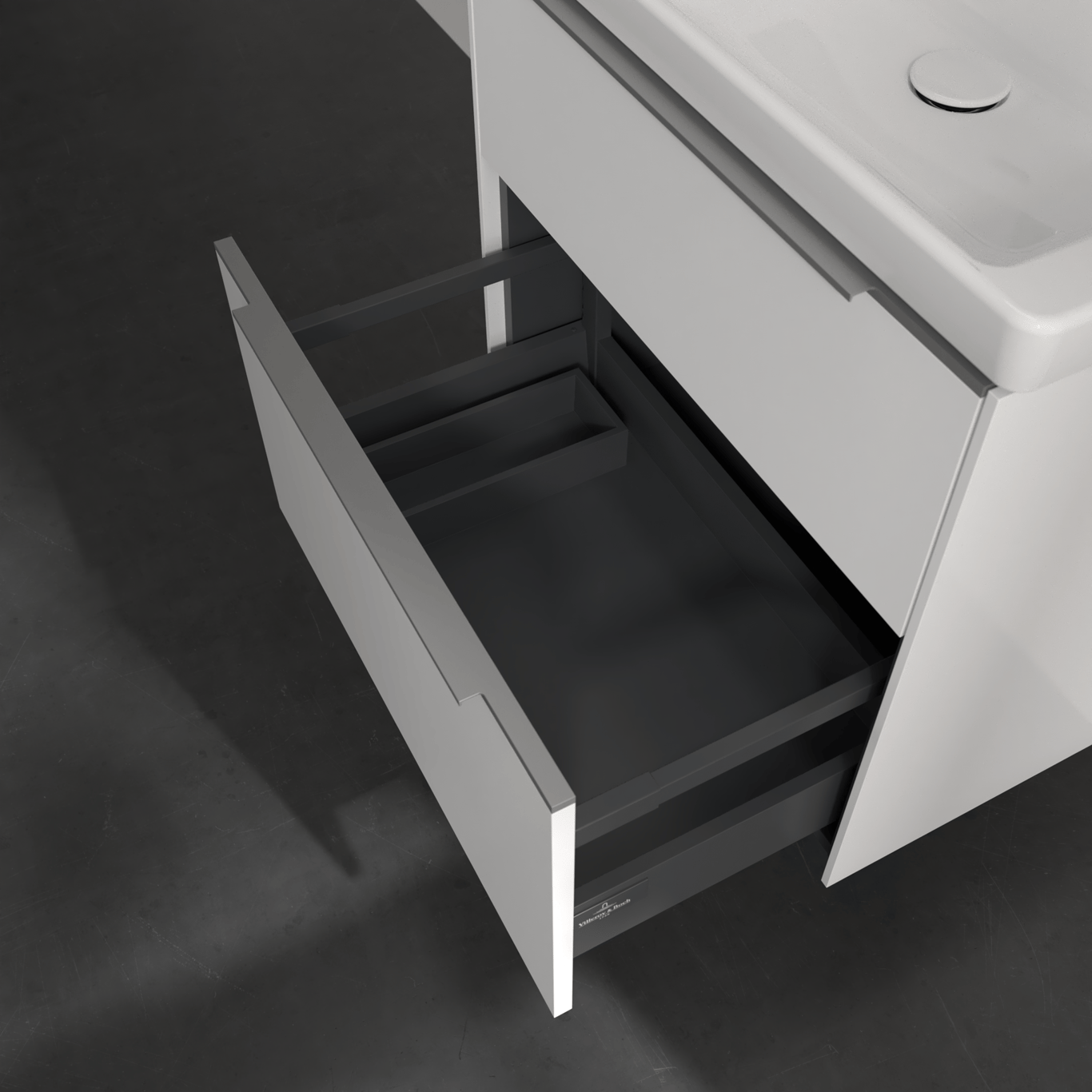 Servantskapet har skuffer med god oppbevaringsplass, og en soft close- og self close-funksjon som sørger for myk lukking, selv når skuffene blir smelt igjen.