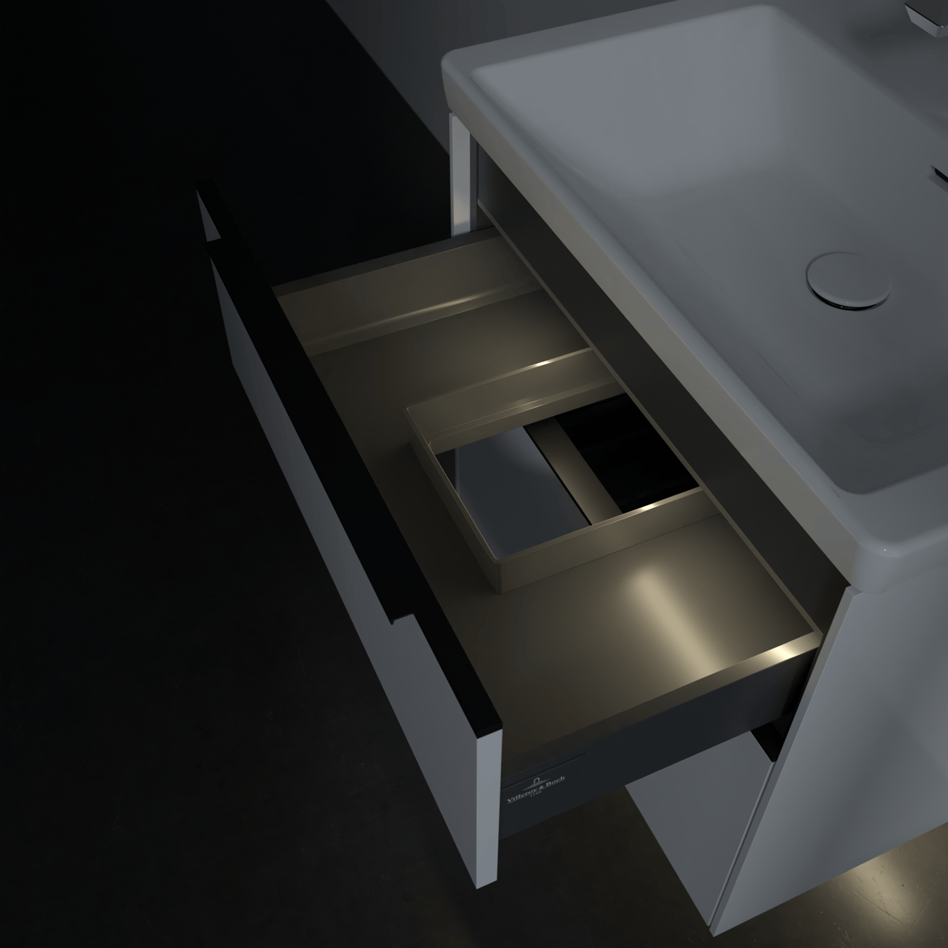 Servantskapet har belyste skuffer med god oppbevaringsplass, og en soft close- og self close-funksjon som sørger for myk lukking, selv når skuffene blir smelt igjen. LED-lyset i skuffen har integrert bevegelsessensor så den automatisk skrur seg på og av når skuffen åpnes og lukkes.