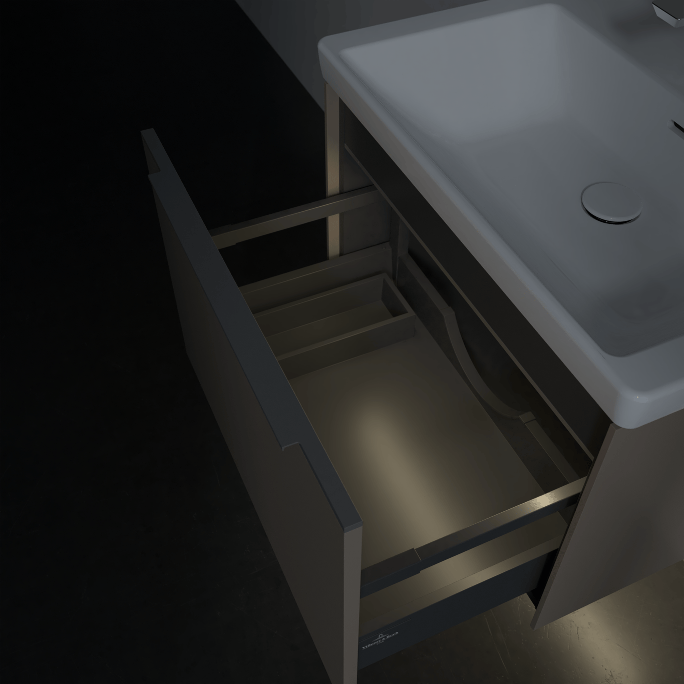Servantskapet har belyste skuffer med god oppbevaringsplass, og en soft close- og self close-funksjon som sørger for myk lukking, selv når skuffene blir smelt igjen. LED-lyset i skuffen har integrert bevegelsessensor så den automatisk skrur seg på og av når skuffen åpnes og lukkes.