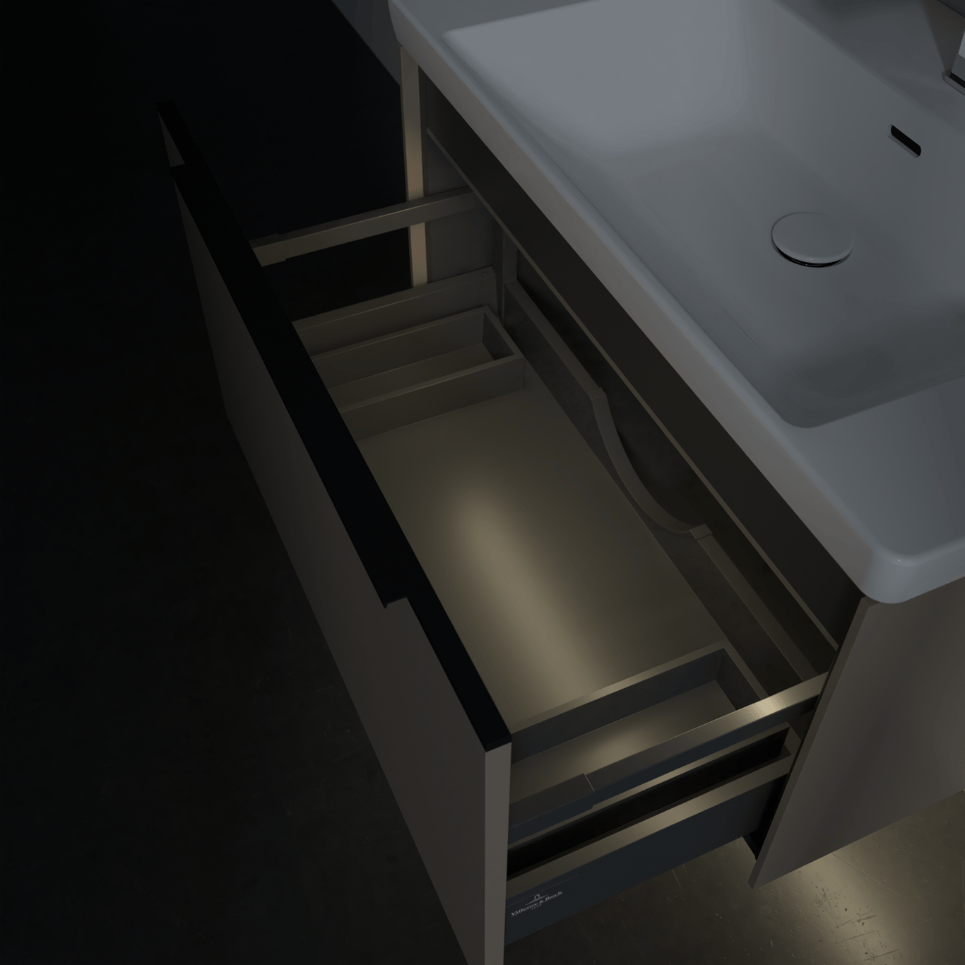 Servantskapet har belyste skuffer med god oppbevaringsplass, og en soft close- og self close-funksjon som sørger for myk lukking, selv når skuffene blir smelt igjen. LED-lyset i skuffen har integrert bevegelsessensor så den automatisk skrur seg på og av når skuffen åpnes og lukkes.