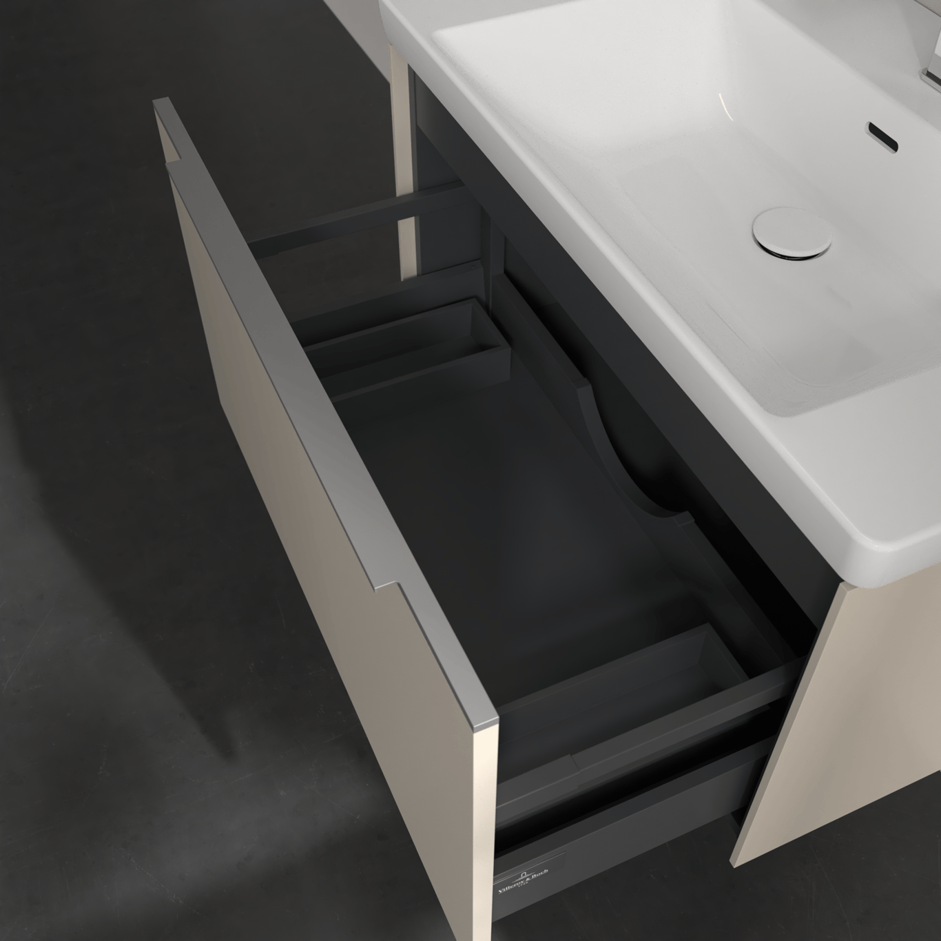 Servantskapet har skuffer med god oppbevaringsplass, og en soft close- og self close-funksjon som sørger for myk lukking, selv når skuffene blir smelt igjen.