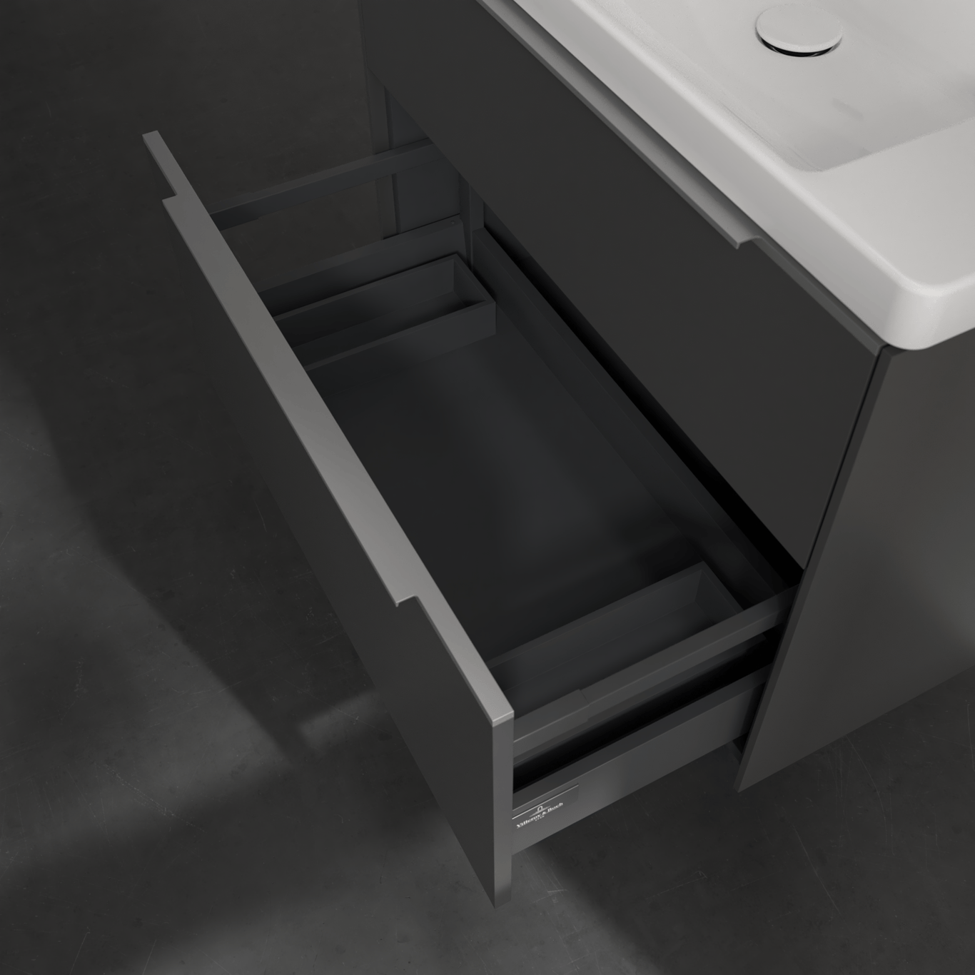 Servantskapet har belyste skuffer med god oppbevaringsplass, og en soft close- og self close-funksjon som sørger for myk lukking, selv når skuffene blir smelt igjen. LED-lyset i skuffen har integrert bevegelsessensor så den automatisk skrur seg på og av når skuffen åpnes og lukkes.