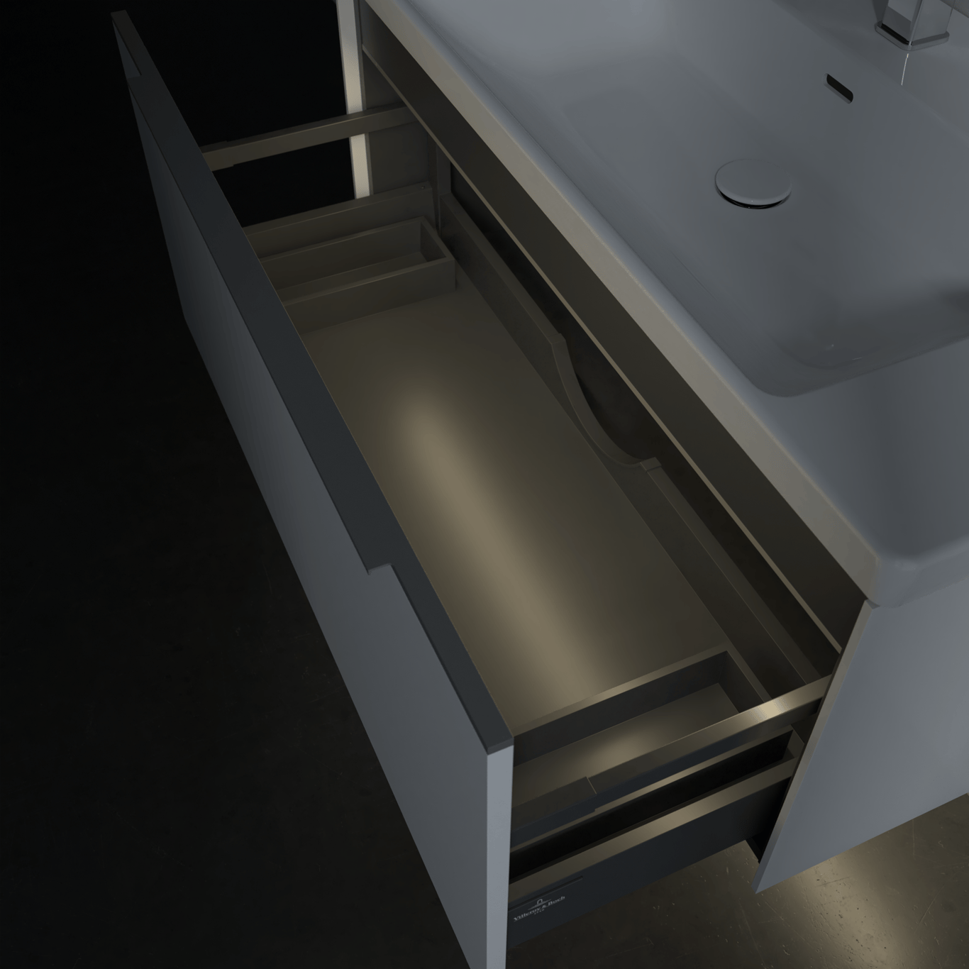 Servantskapet har belyste skuffer med god oppbevaringsplass, og en soft close- og self close-funksjon som sørger for myk lukking, selv når skuffene blir smelt igjen. LED-lyset i skuffen har integrert bevegelsessensor så den automatisk skrur seg på og av når skuffen åpnes og lukkes.