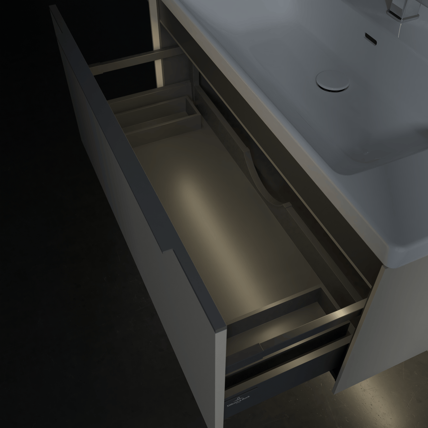 Servantskapet har belyste skuffer med god oppbevaringsplass, og en soft close- og self close-funksjon som sørger for myk lukking, selv når skuffene blir smelt igjen. LED-lyset i skuffen har integrert bevegelsessensor så den automatisk skrur seg på og av når skuffen åpnes og lukkes.