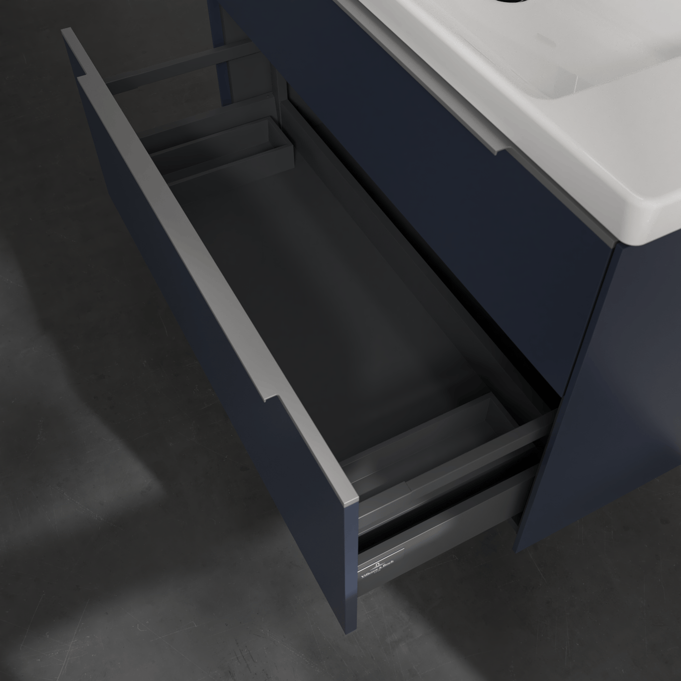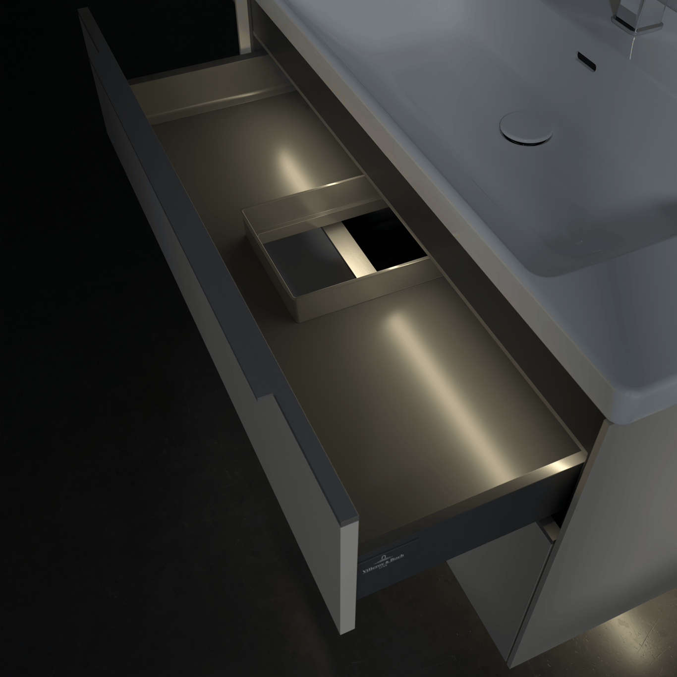 Servantskapet har belyste skuffer med god oppbevaringsplass, og en soft close- og self close-funksjon som sørger for myk lukking, selv når skuffene blir smelt igjen. LED-lyset i skuffen har integrert bevegelsessensor så den automatisk skrur seg på og av når skuffen åpnes og lukkes.