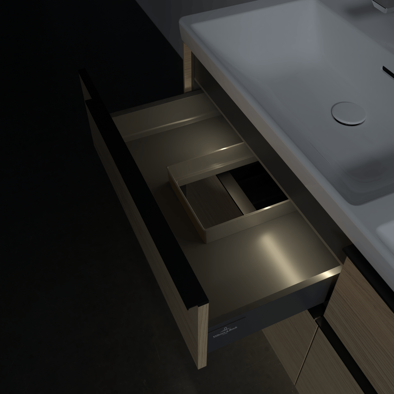 Servantskapet har belyste skuffer med god oppbevaringsplass, og en soft close- og self close-funksjon som sørger for myk lukking, selv når skuffene blir smelt igjen. LED-lyset i skuffen har integrert bevegelsessensor så den automatisk skrur seg på og av når skuffen åpnes og lukkes.