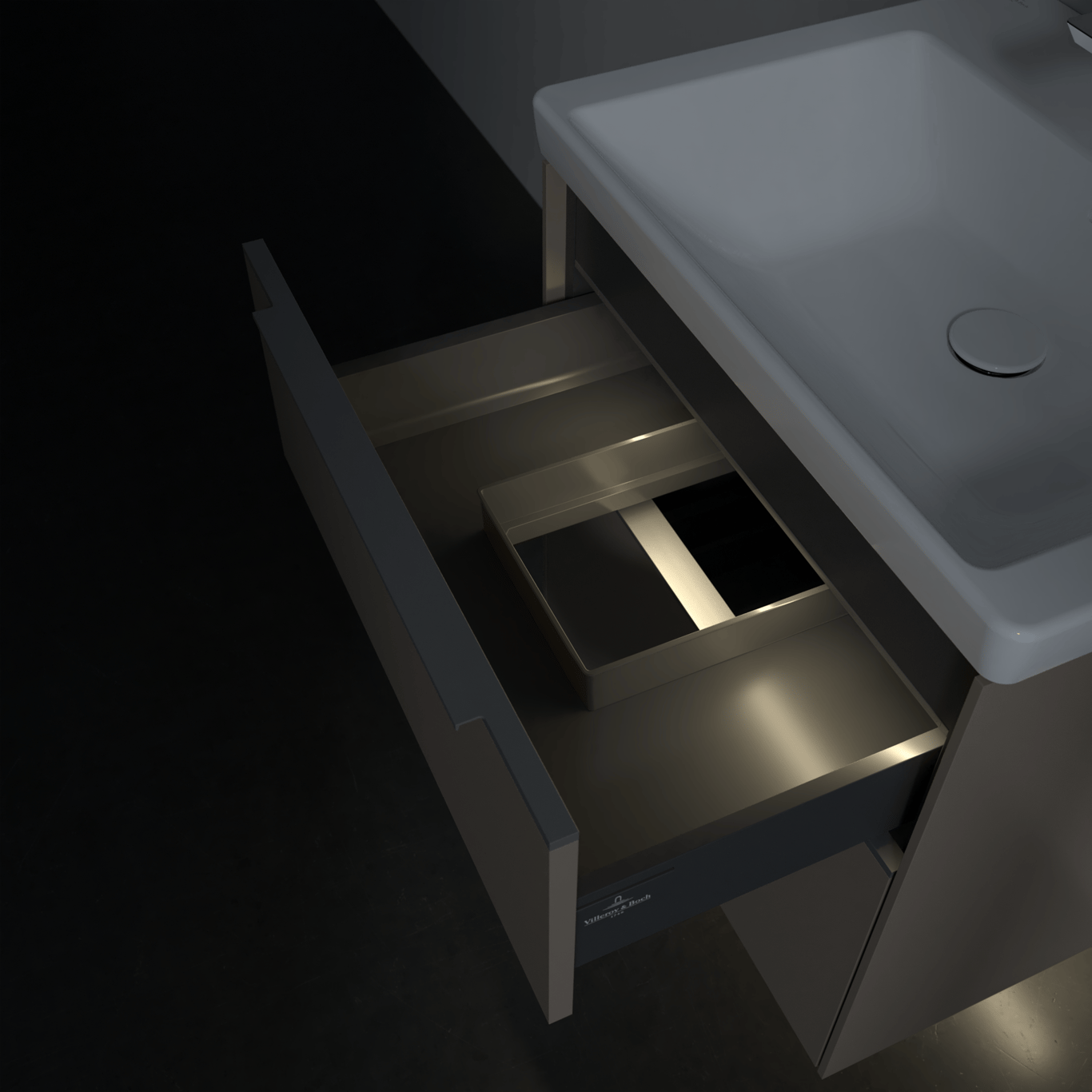 Servantskapet har belyste skuffer med god oppbevaringsplass, og en soft close- og self close-funksjon som sørger for myk lukking, selv når skuffene blir smelt igjen. LED-lyset i skuffen har integrert bevegelsessensor så den automatisk skrur seg på og av når skuffen åpnes og lukkes.