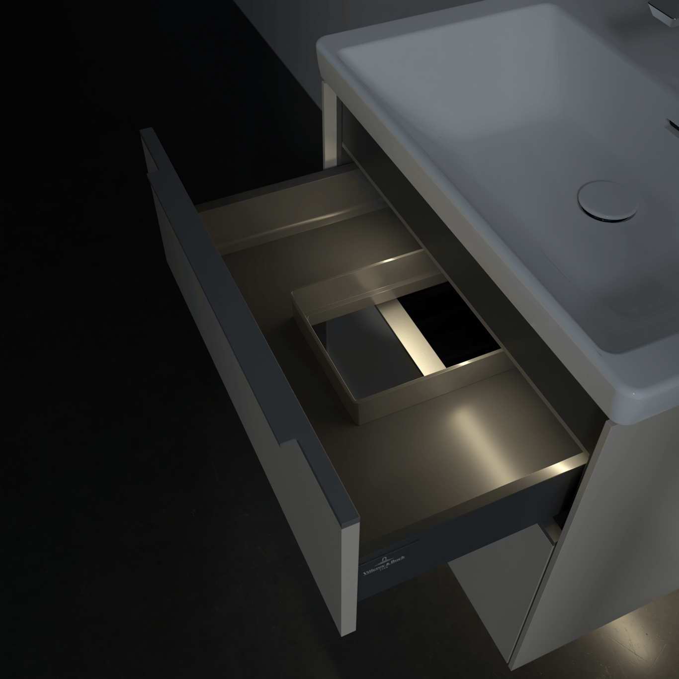 Servantskapet har belyste skuffer med god oppbevaringsplass, og en soft close- og self close-funksjon som sørger for myk lukking, selv når skuffene blir smelt igjen. LED-lyset i skuffen har integrert bevegelsessensor så den automatisk skrur seg på og av når skuffen åpnes og lukkes.
