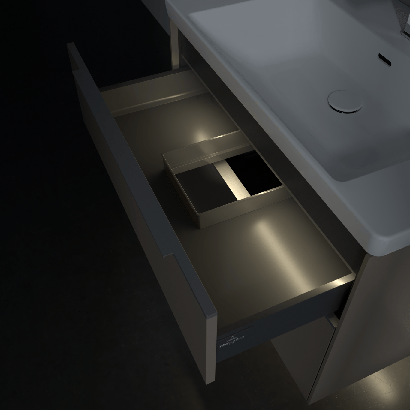 Servantskapet har belyste skuffer med god oppbevaringsplass, og en soft close- og self close-funksjon som sørger for myk lukking, selv når skuffene blir smelt igjen. LED-lyset i skuffen har integrert bevegelsessensor så den automatisk skrur seg på og av når skuffen åpnes og lukkes.