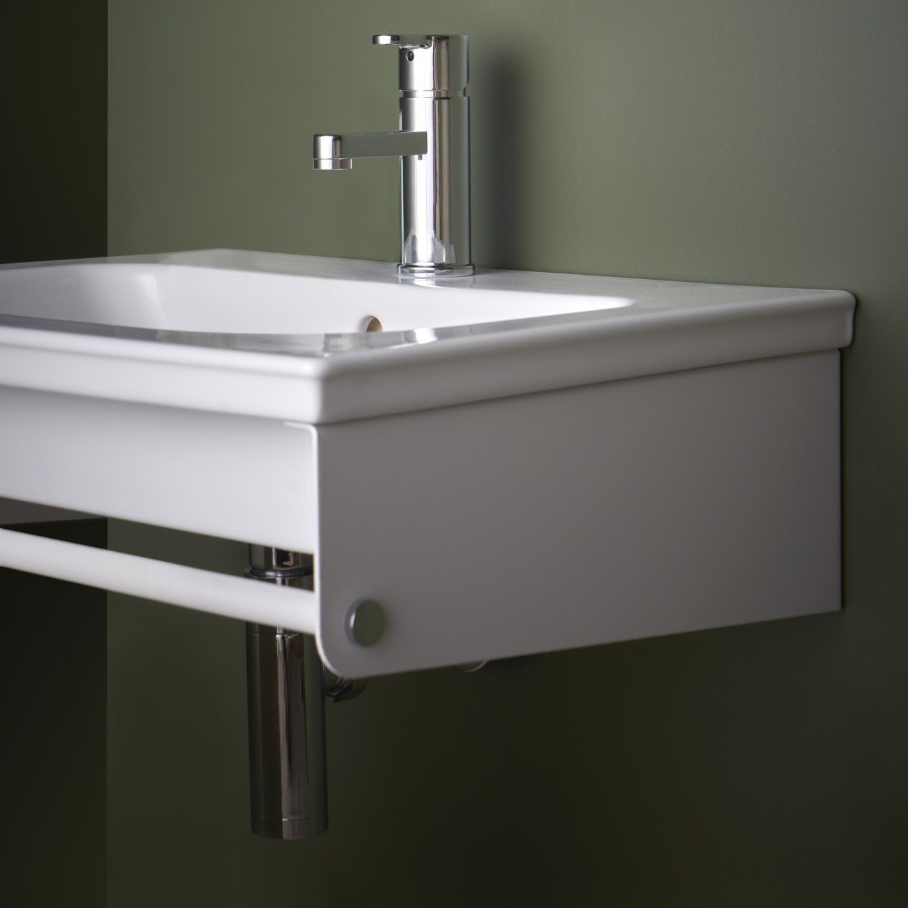 Servantkonsoll i 60 cm for veggmontering av Gustavsberg Graphic-servant. Med denne veggkonsollen i hvitlakkert stål får du et elegant veggoppheng med praktisk håndklestang i front. Monteres med skruer og evt. plugger.