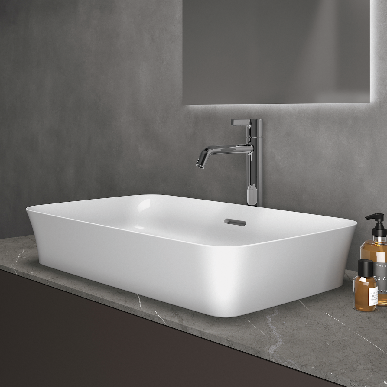Servanten har en glatt overflate som gjør det enkelt å rengjøre og den kan enkelt monteres direkte på en benkeplate. Sammen med et høyt servantbatteri vil den skape et elegant uttrykk på baderommet.