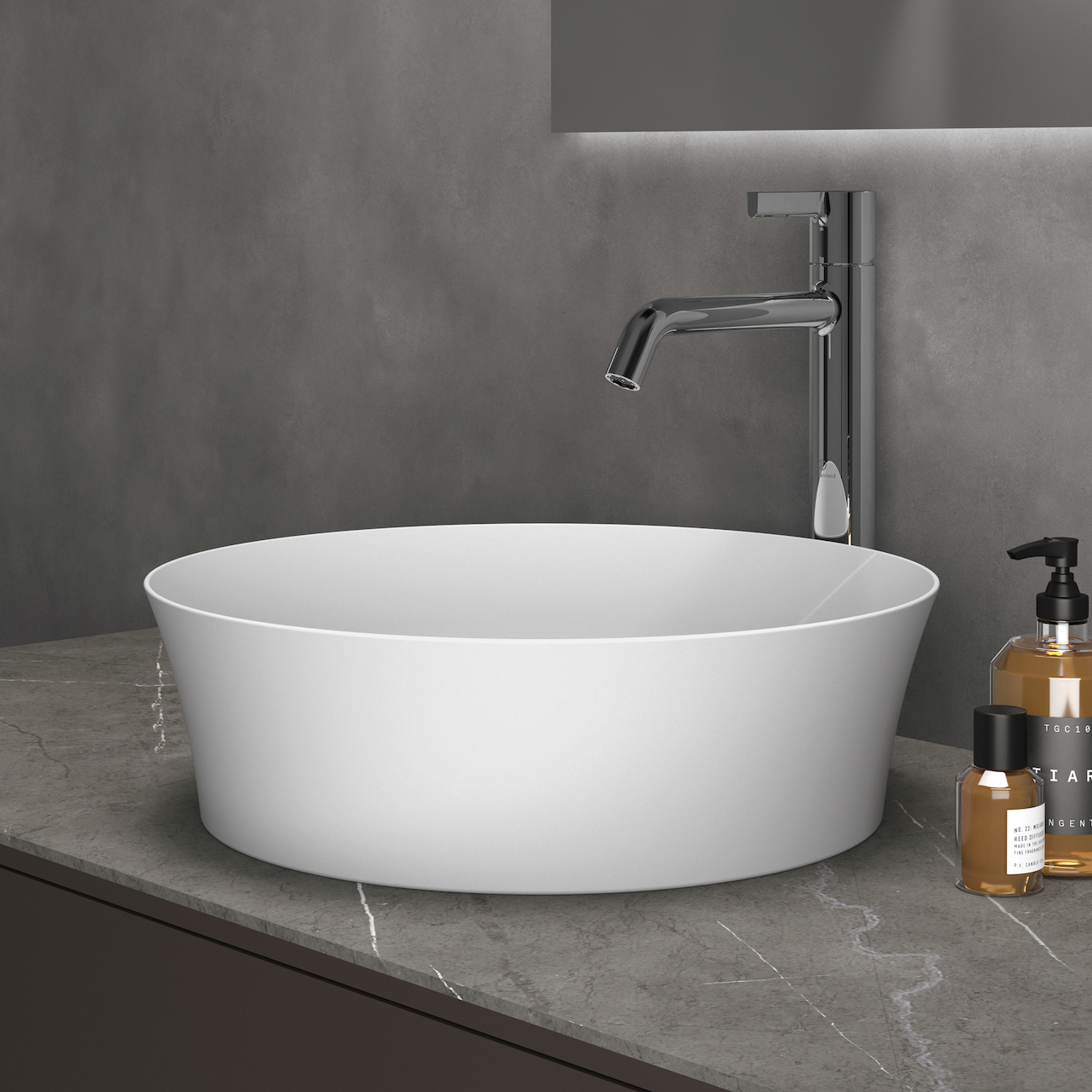Servanten har en glatt overflate som gjør det enkelt å rengjøre og den kan enkelt monteres direkte på en benkeplate. Sammen med et høyt servantbatteri vil den skape et elegant uttrykk på baderommet.