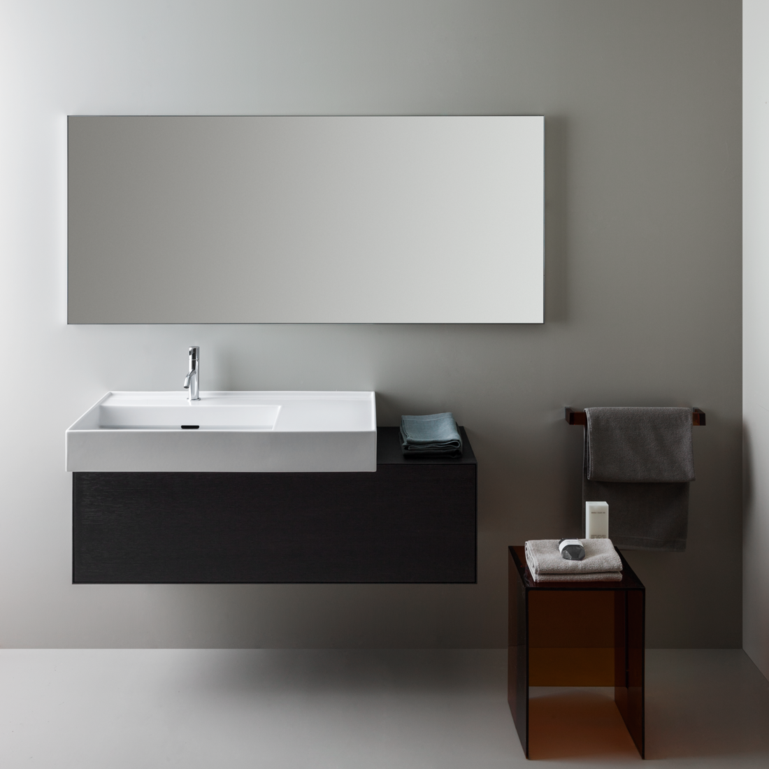 Romslig vaskebassengHøy kant mot veggen beskytter mot vannsølEkstra tynne kanter takket være SaphirKeramik-teknologien