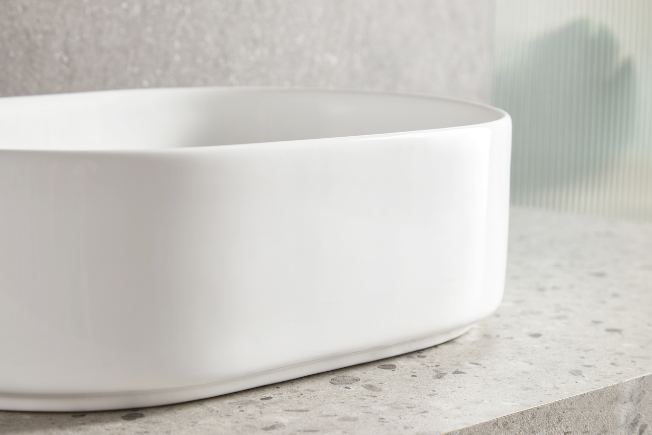 Denne frittstående servanten fra Lind har et stilrent design, og sammen med et høyt servantbatteri vil den skape et moderne uttrykk på badet.