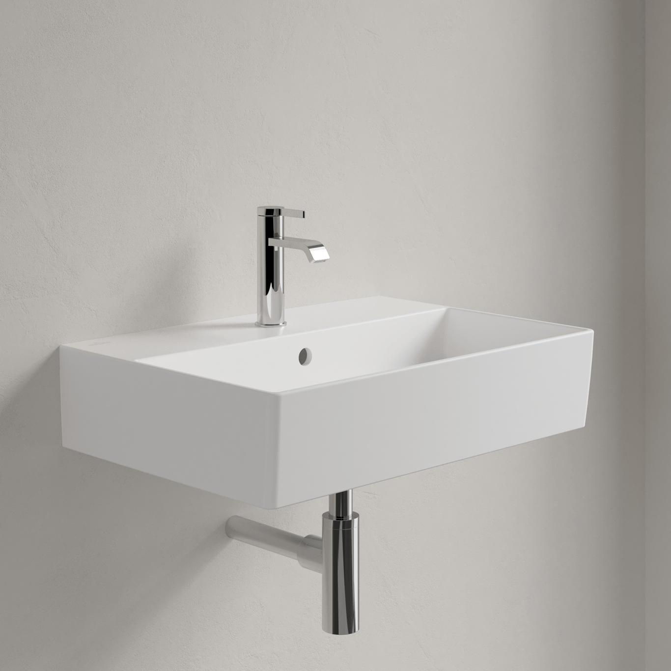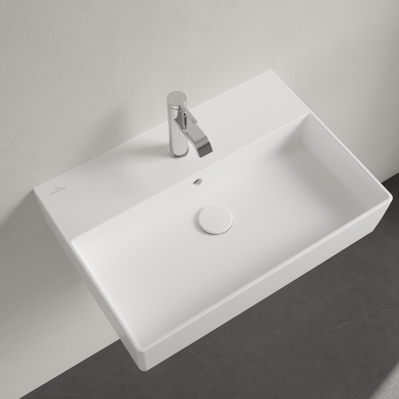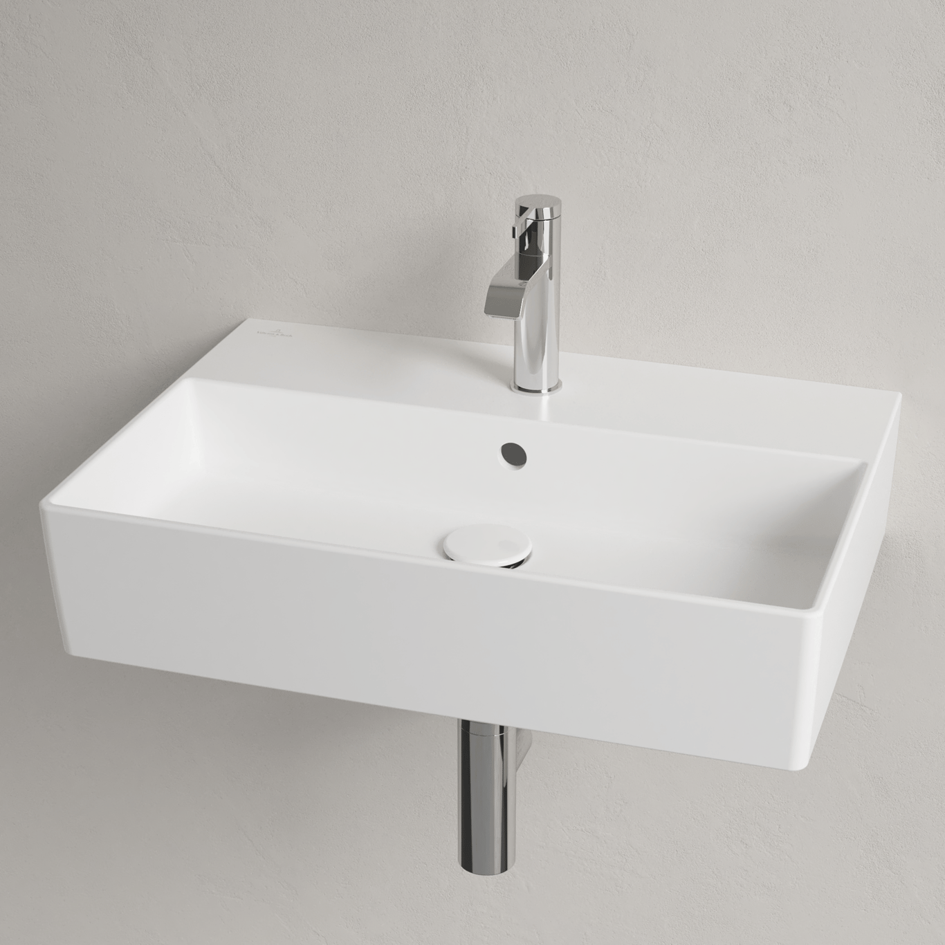 Denne servanten fra Villeroy & Boch har et stilrent design med rette linjer. Den kan både topp- og veggmonteres.