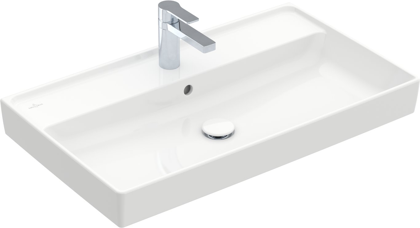 Denne stilrene servanten fra Villeroy & Boch har tynne og rette kanter, med en stilig karakteristisk kant som også passer på så det ikke spruter vann utover hele benken.