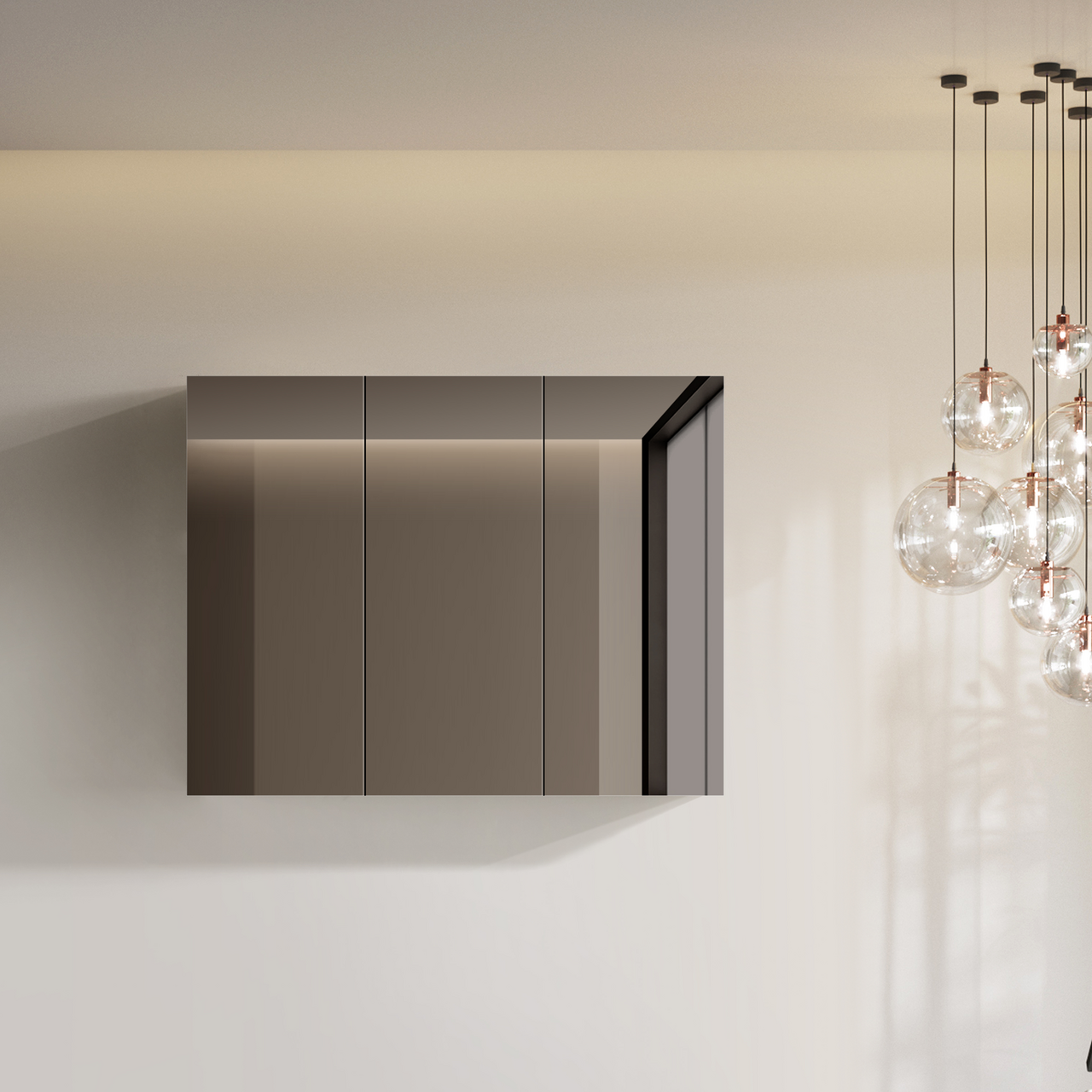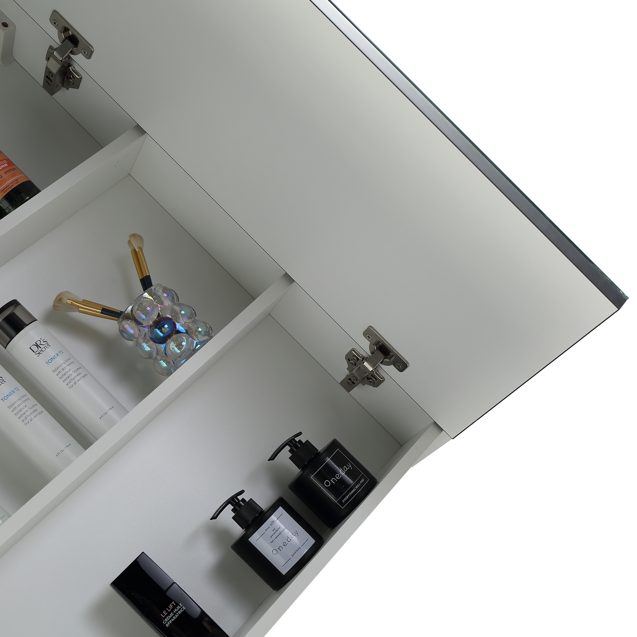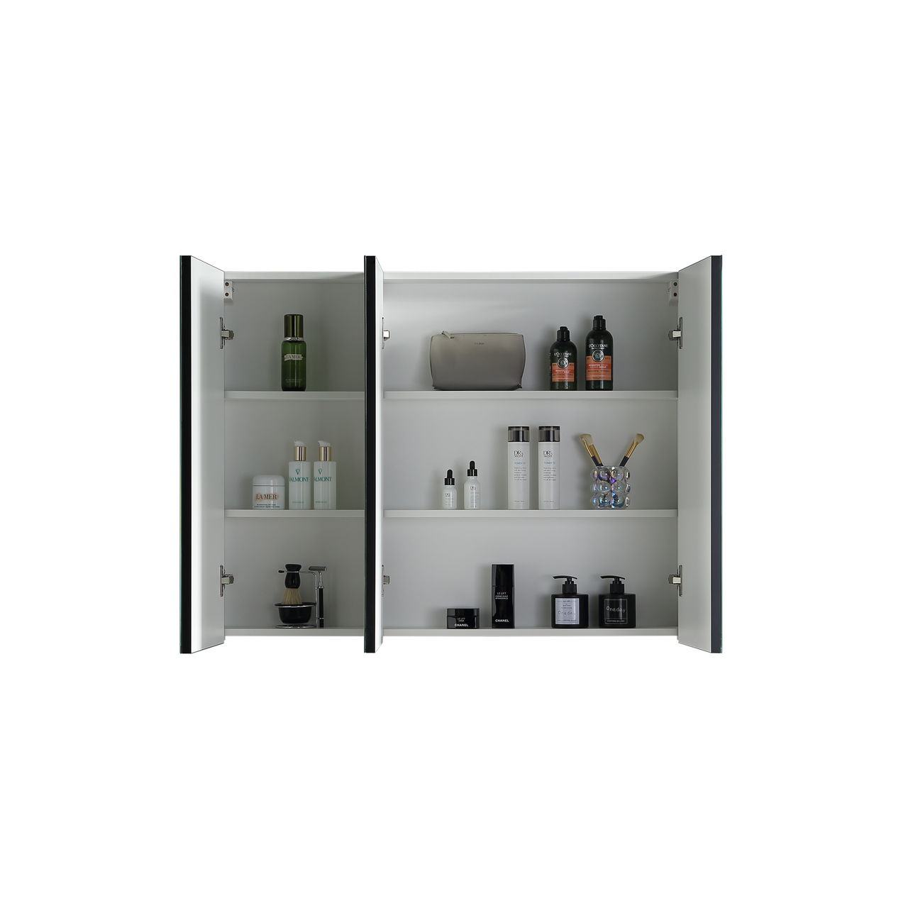 Speilskap i foliert MDF og spon, kommer med topp og sidepaneler i matt sort overflate. Åpnes lett i nedkant av hvert speilpanel. Skapet leveres med to hyller og monteres enkelt på vegg, med medfølgende festebeslag.