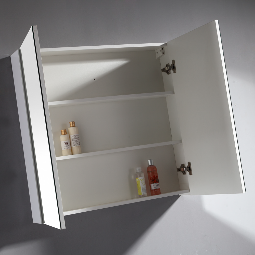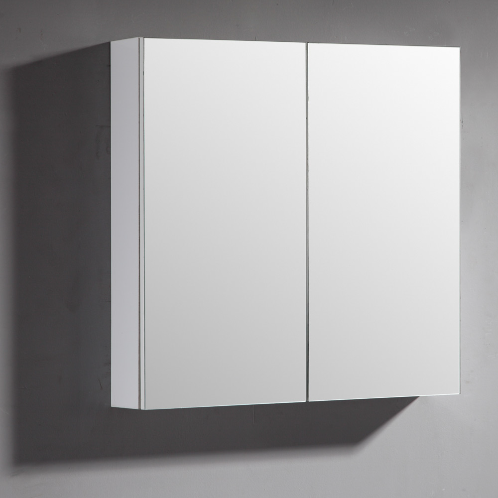 Speilskap i foliert MDF og spon, kommer med topp og sidepaneler i hvit høyglanset overflate. Åpnes lett i nedkant av hvert speilpanel. Speilskapet leveres i tre ulike størrelser. Alle skapene leveres med to hyller. Speilskapet monteres enkelt på vegg, med medfølgende festebeslag. Speilskapene er godt egnet ved behov av ekstra oppbevaring på baderommet. Flere hyller gjør organiseringen av småting enkel, og tilgjengeligheten bedre. Bruk av speil vil ha en forstørrende effekt på rommet, samtidig som de rette linjene strammer opp inntrykket.
