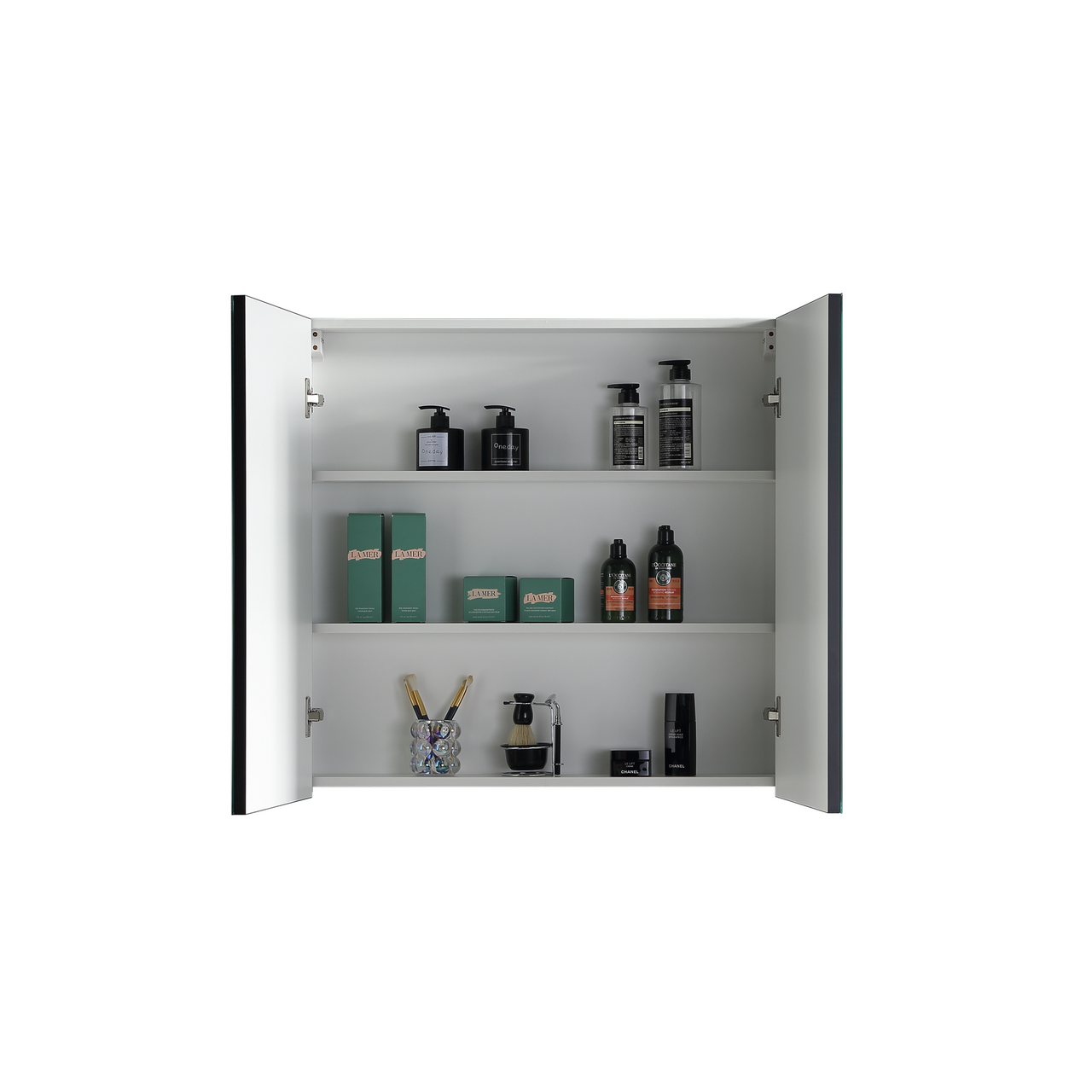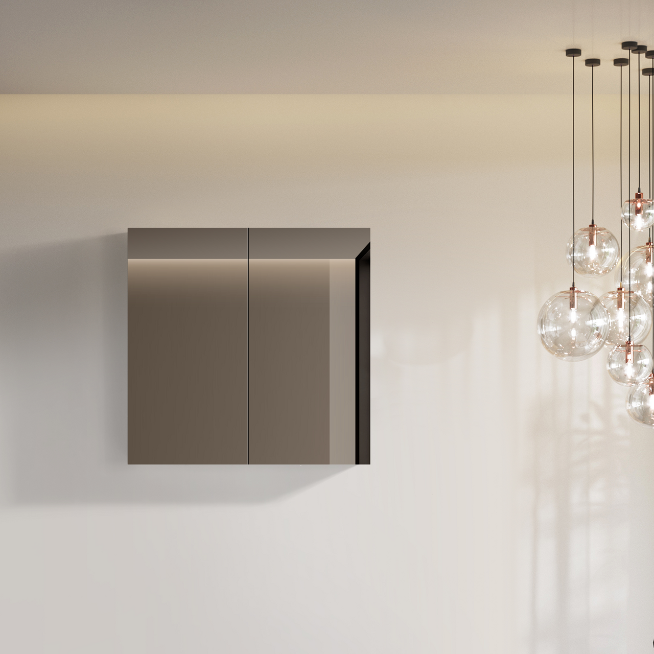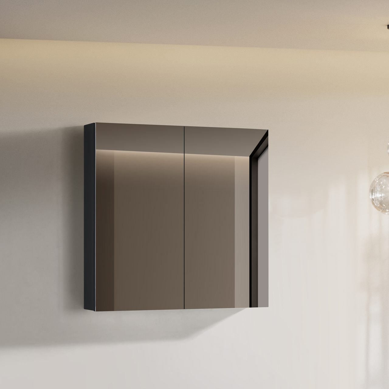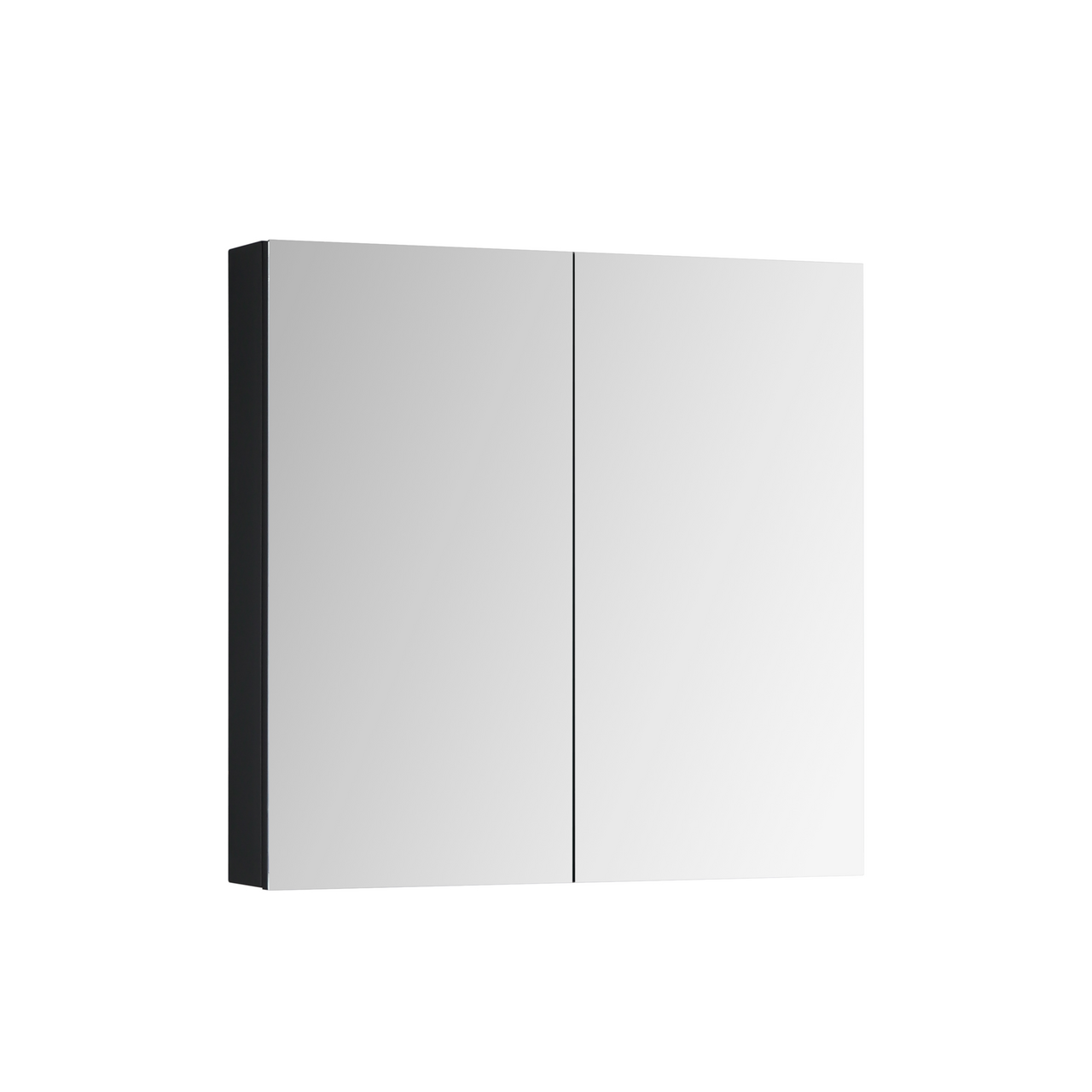 Speilskap i foliert MDF og spon, kommer med topp og sidepaneler i en matt sort overflate. Åpnes lett i underkant av hvert speilpanel. Skapet kommer med to dører og har to hyller innvendig. Speilskapet monteres enkelt på vegg, med medfølgende festebeslag.
