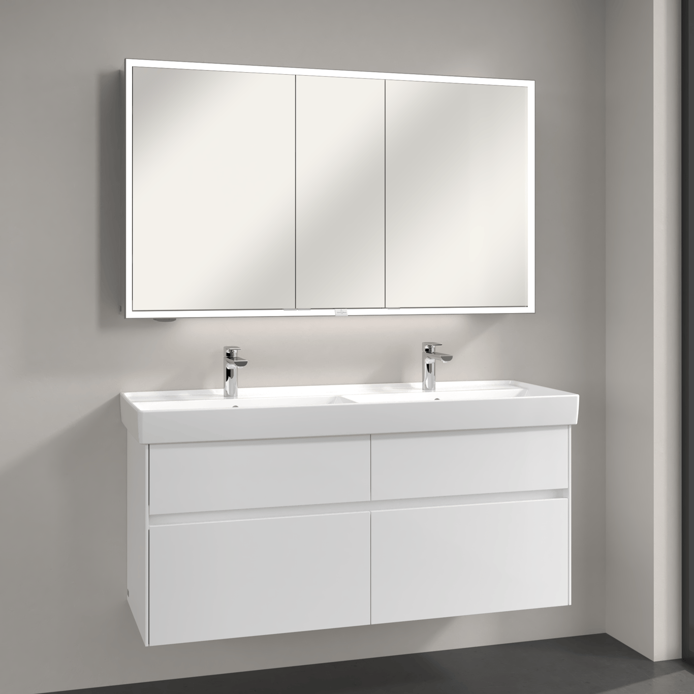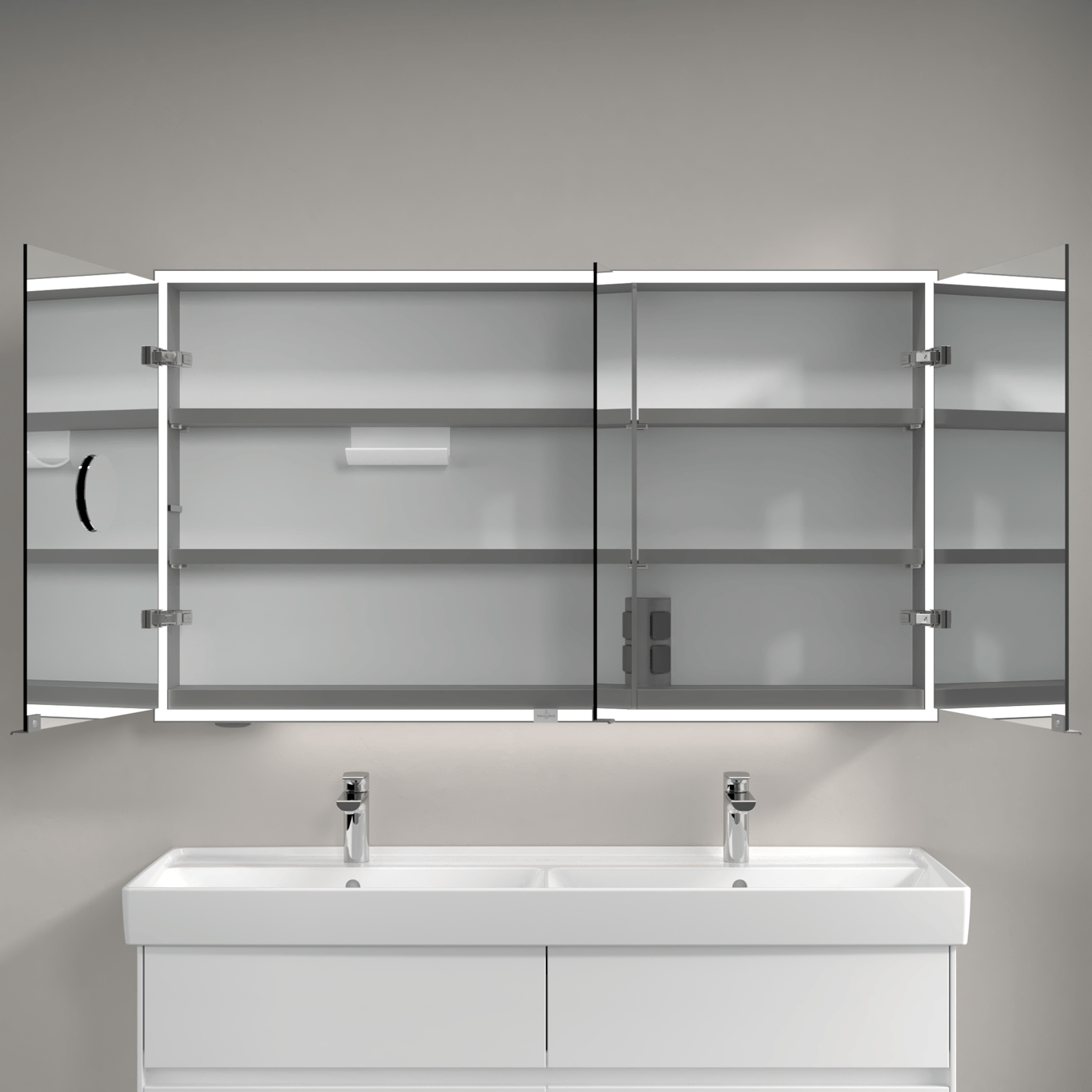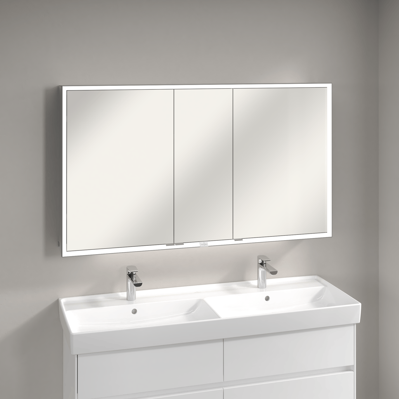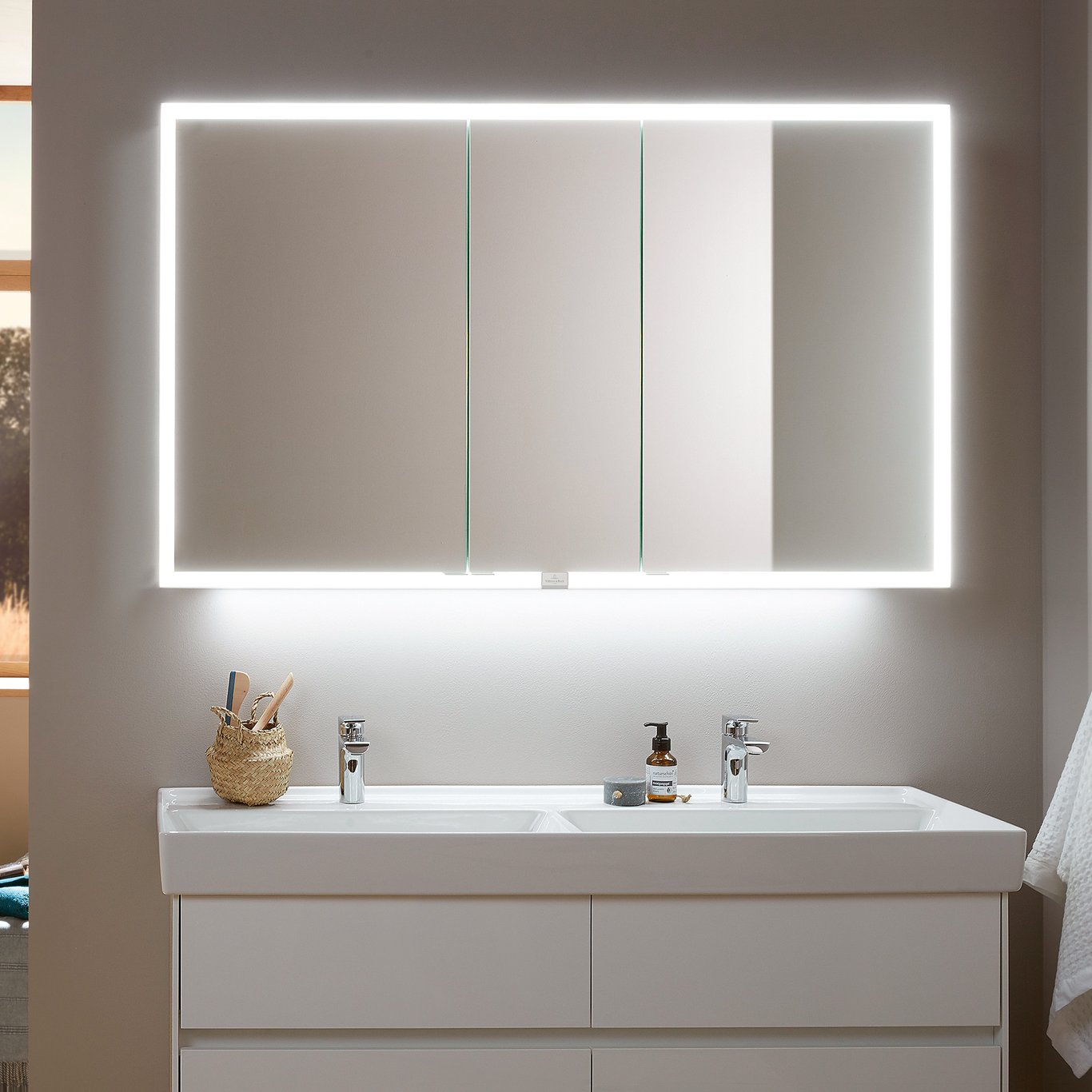 Dette speilskapet fra Villeroy & Boch har integrert LED-lys, og et smart system for oppbevaring av baderomsartikler.