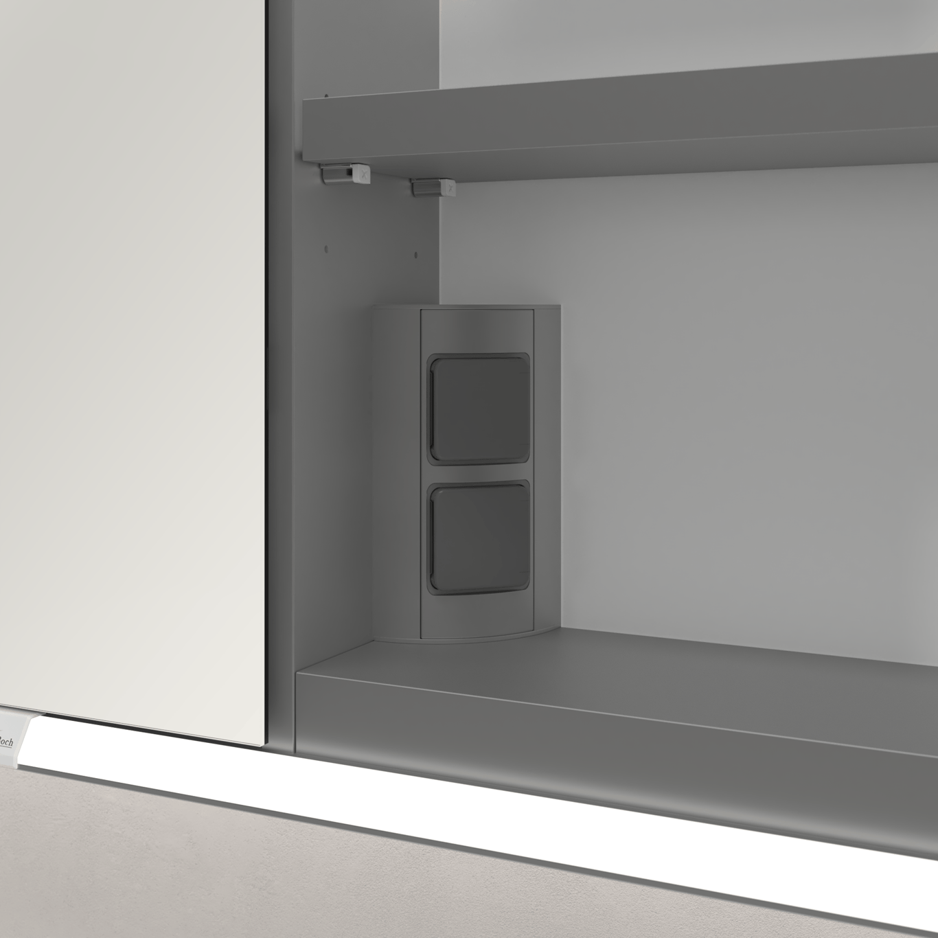 Skapet har et smart system for oppbevaring som består av hyller, en magnetstripe for enkel oppheng av for eksempel pinsett og neglesaks, og stikkontakter, og et mindre forstørrelsesspeil.
