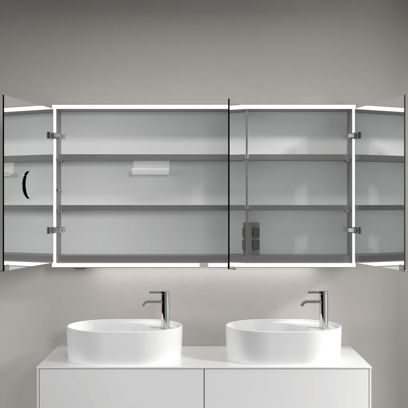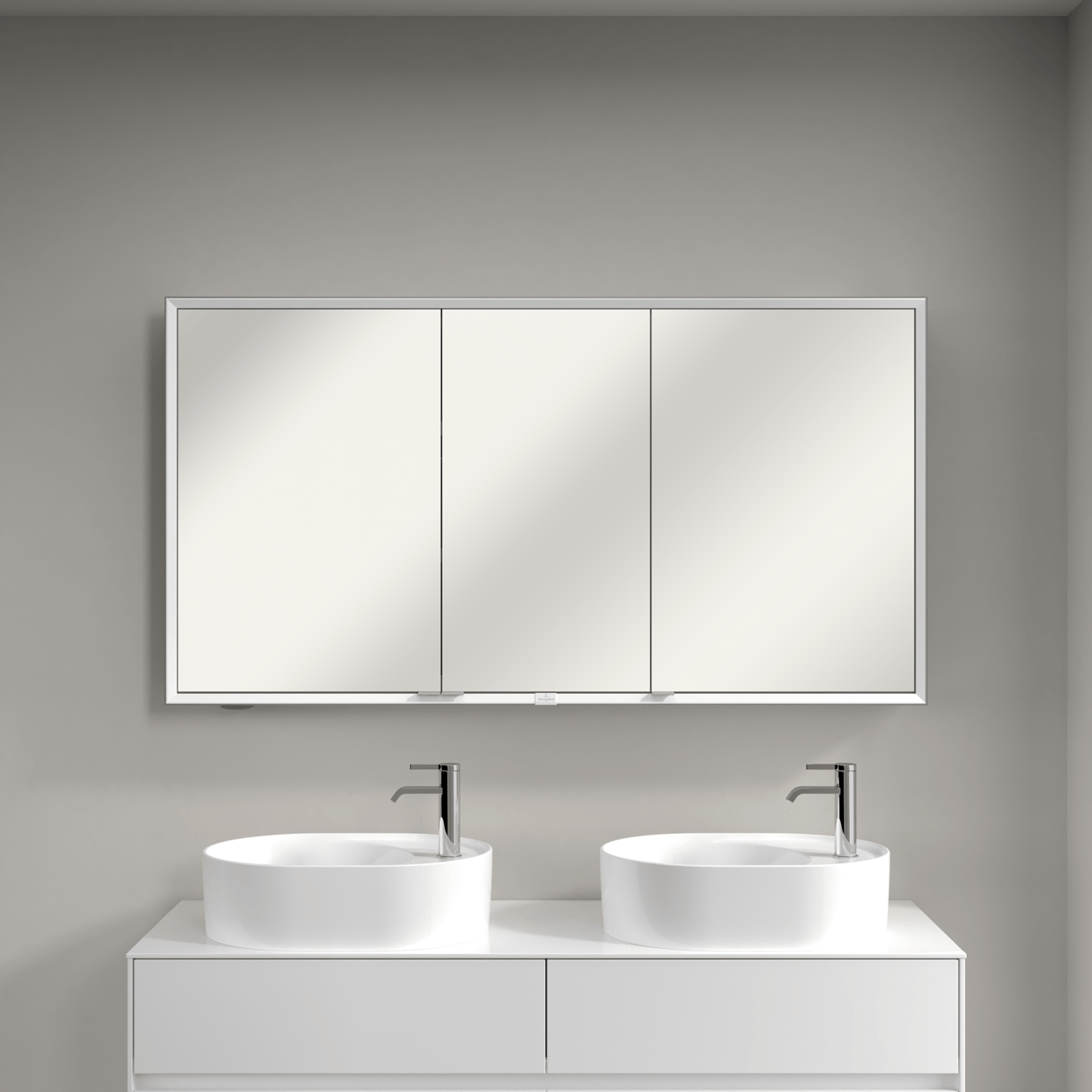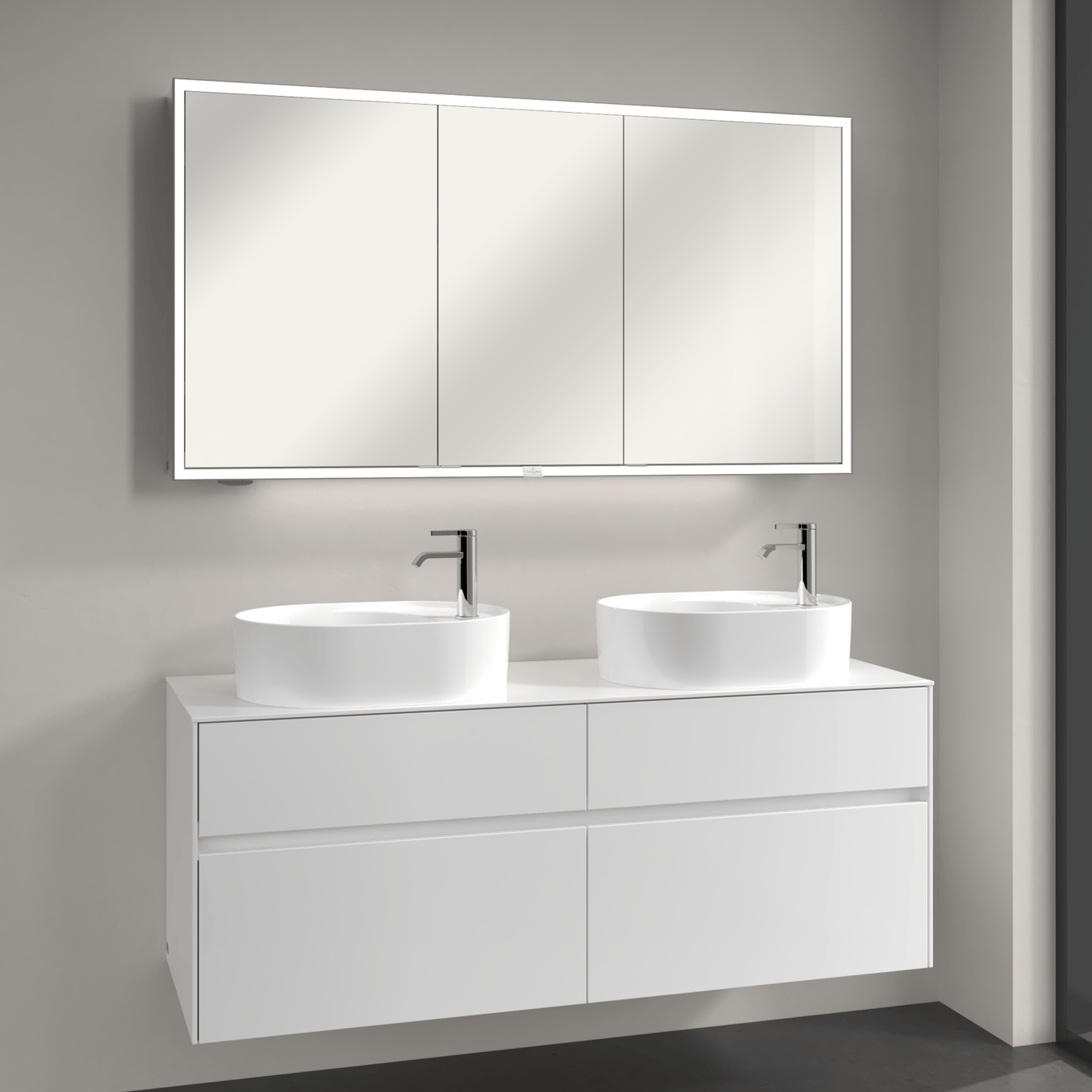 Dette speilskapet fra Villeroy & Boch har integrert LED-lys, og et smart system for oppbevaring av baderomsartikler.