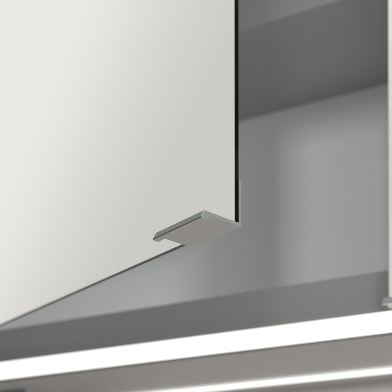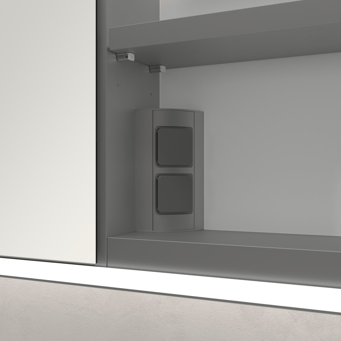 Skapet har et smart system for oppbevaring som består av hyller, en magnetstripe for enkel oppheng av for eksempel pinsett og neglesaks, og stikkontakter, og et mindre forstørrelsesspeil.