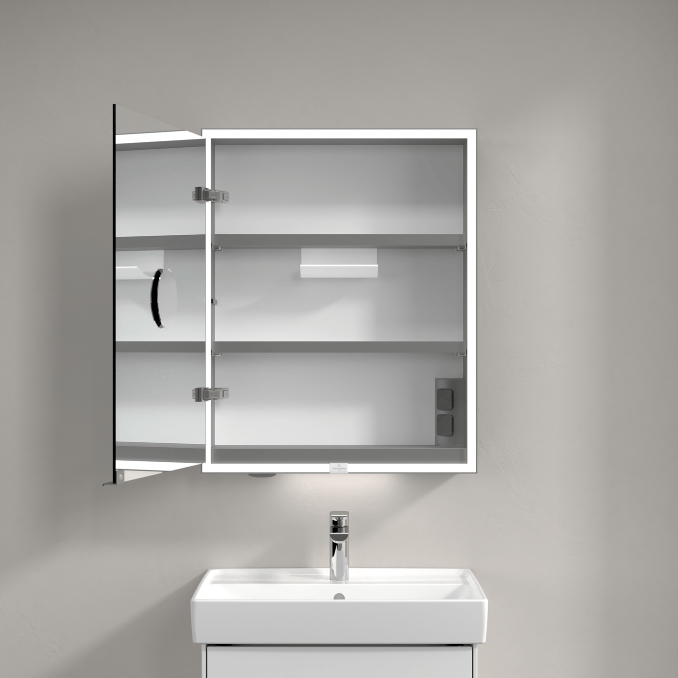 Dette speilskapet fra Villeroy & Boch har integrert LED-lys, og et smart system for oppbevaring av baderomsartikler.