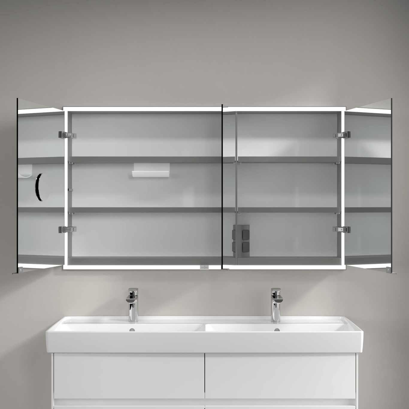 Dette speilskapet fra Villeroy & Boch er laget for å bygges inn i veggen og har integrert LED-lys, og et smart system for oppbevaring av baderomsartikler.