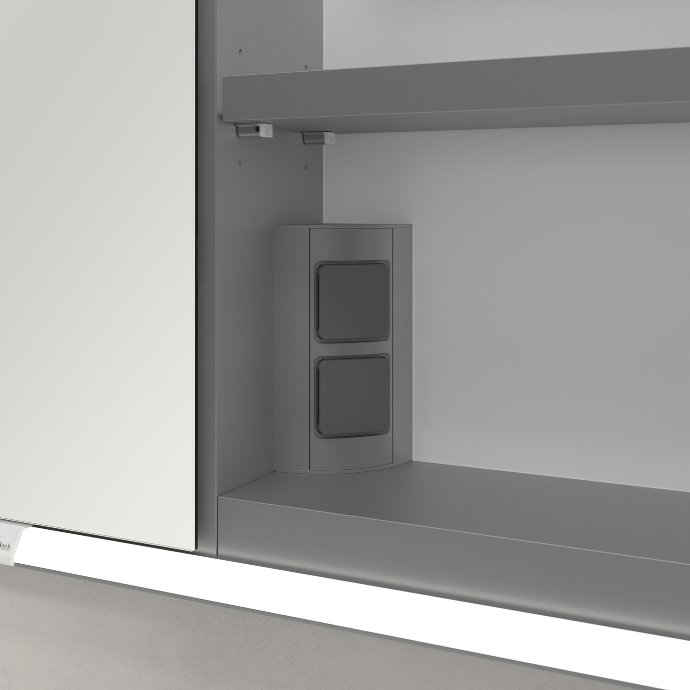 - Følger med: 3 x dører 1 x sensordemper på utsiden 2 x stikkontakt på innsiden (høyre) 4 x aluminiumshyller 1 x oppbevaringsskål 1 x forstørrelsesspeil 1 x magnetlist