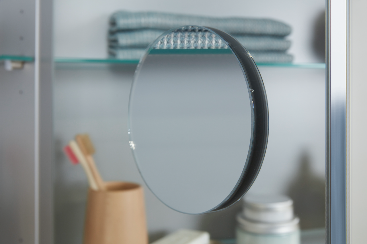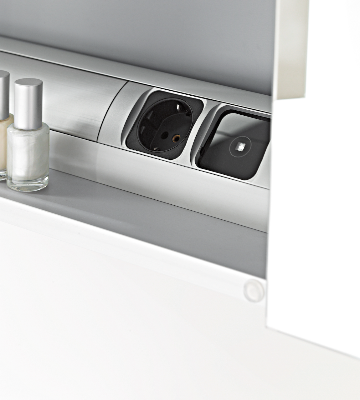 Skapet har et smart system for oppbevaring som består av fire glasshyller, en magnetstripe for enkel oppheng av for eksempel pinsett og neglesaks, og stikkontakt. Det er også speil på innsiden av skapdørene, og et mindre forstørrelsesspeil.