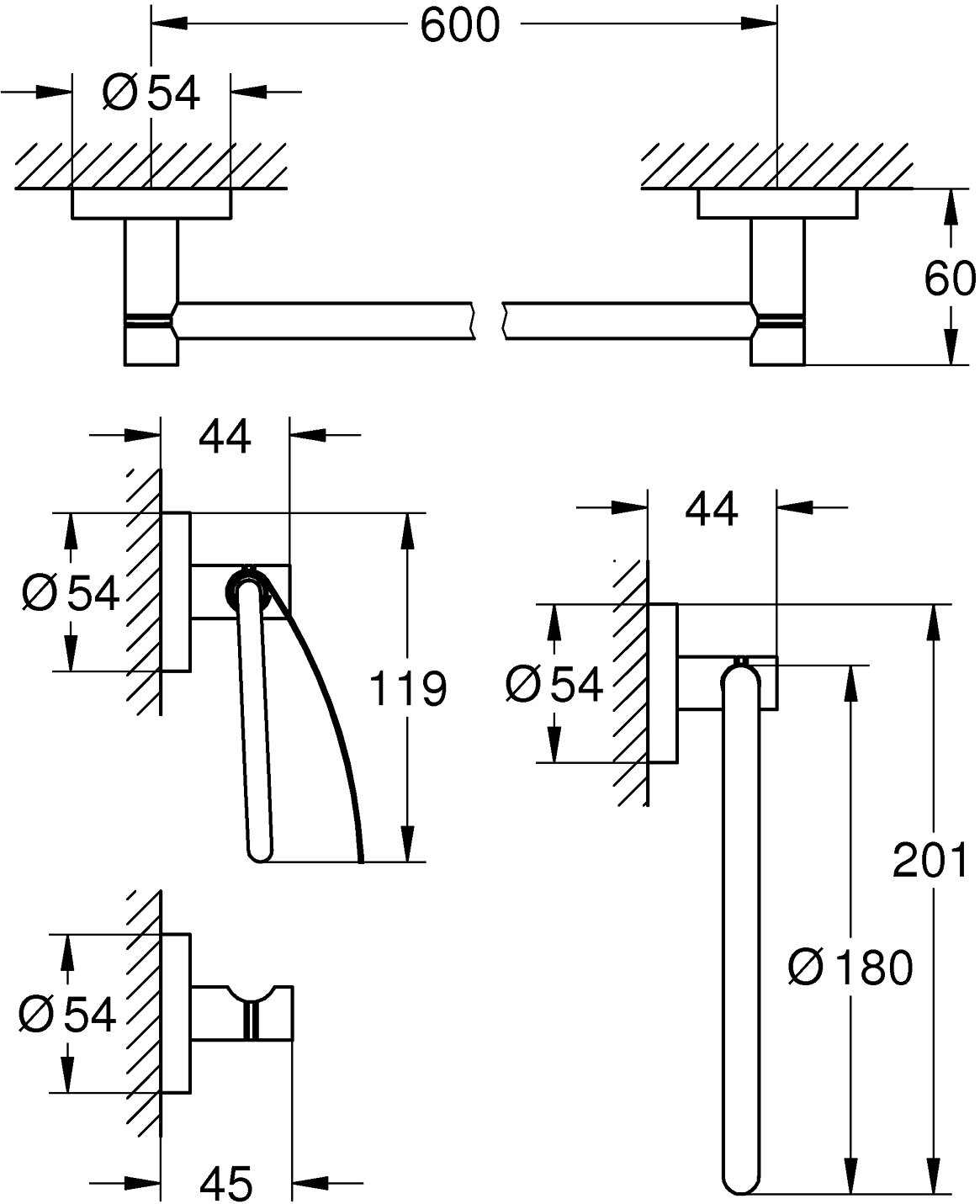 Dette tilbehørssettet fra Grohe består av en håndklering, en håndklekrok, en toalettpapirholder, og en håndkletørker.