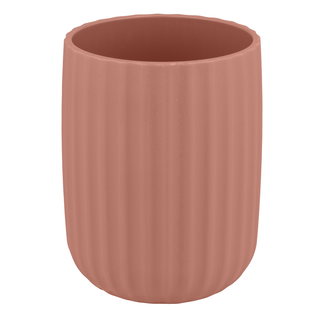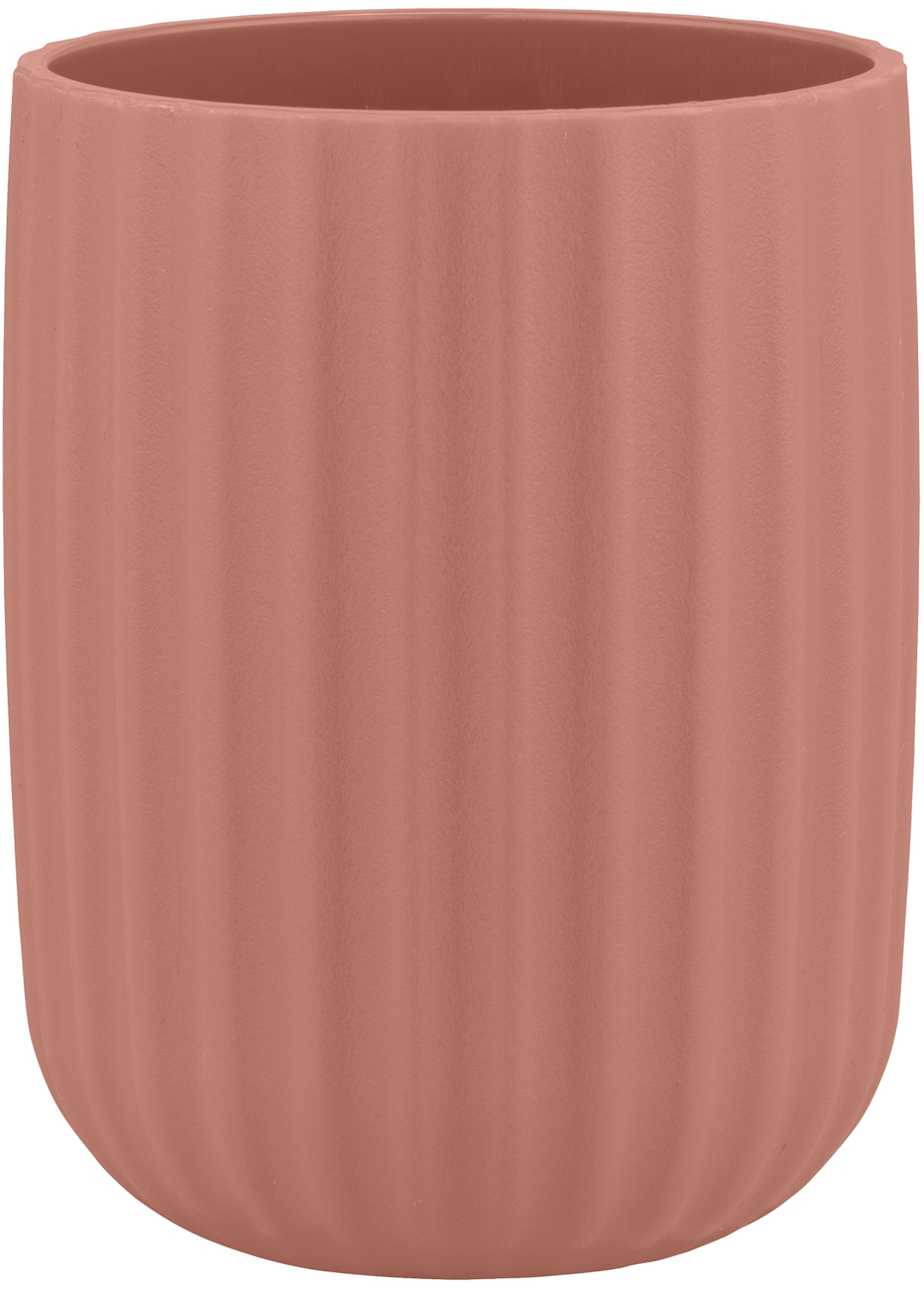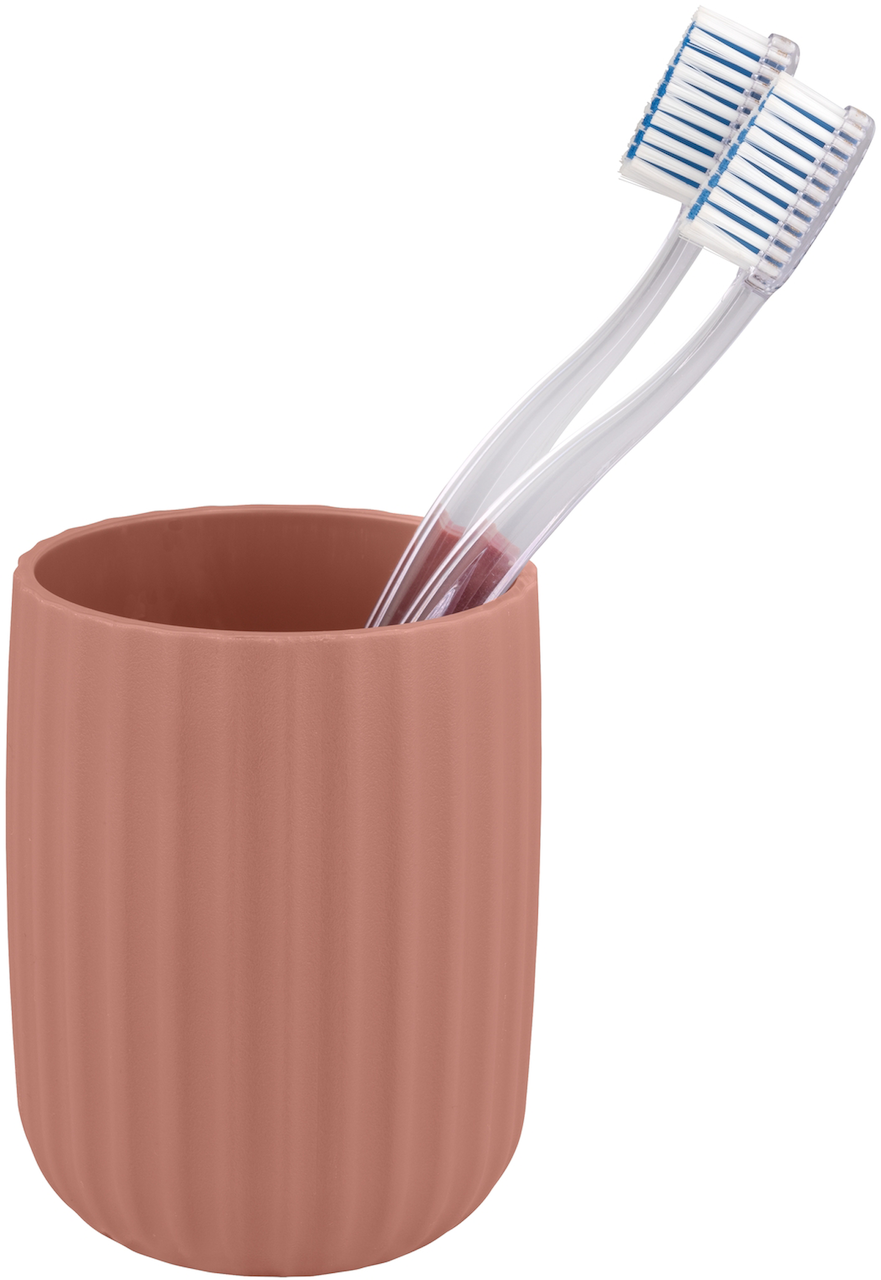Dette tannglasset fra Wenko har en rillet struktur i rosa, som bidrar til et friskt uttrykk på badet.
