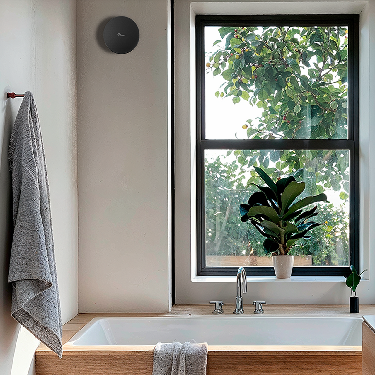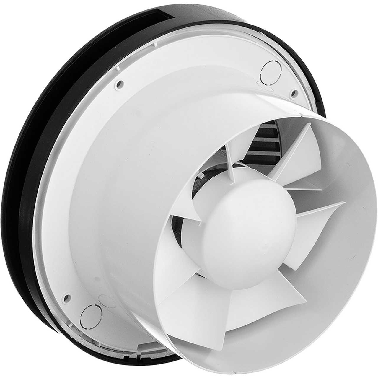 Den runde, sorte fronten passer ideellt i mørke baderom, og kulelager gir stabil og langvarig drift med lavt støynivå.