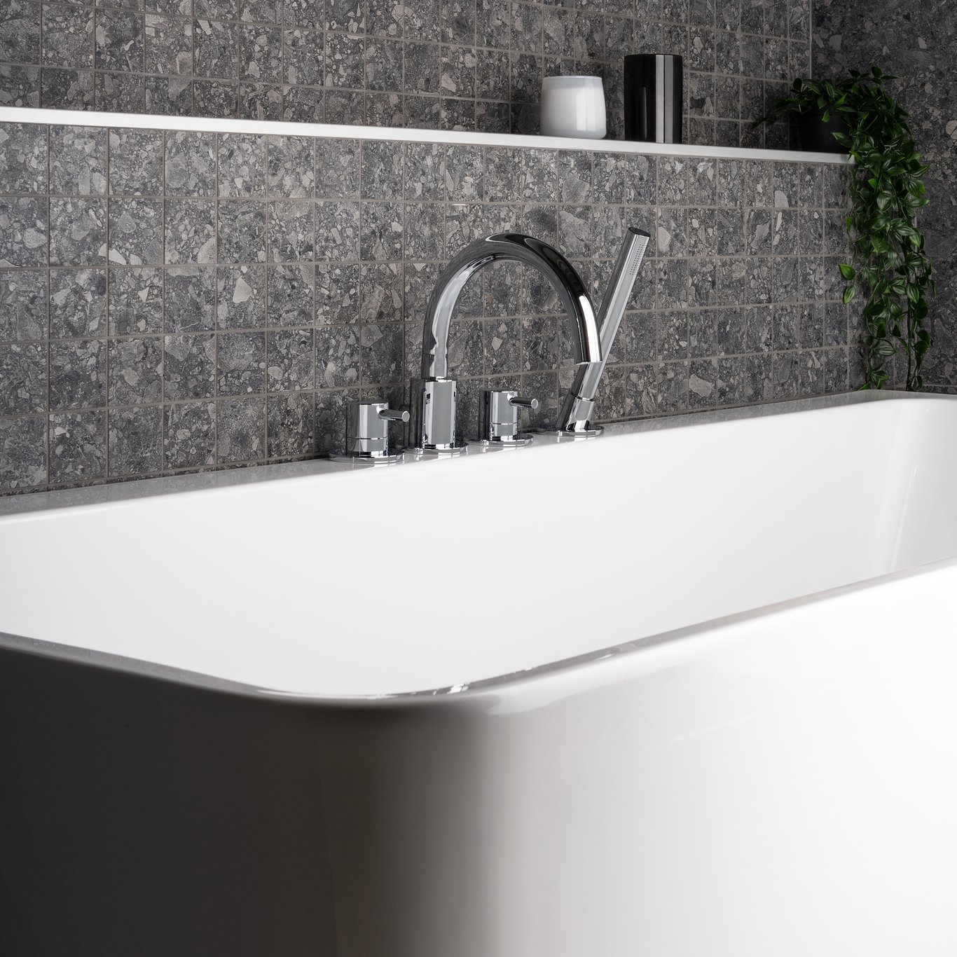 Dette moderne badekararmaturet kommer i krom utførelse med et rundt design. Her får du et stilrent armatur som passer perfekt til montering på kanten av badekaret. Med de to hendlene kan du enkelt regulere vannmengde og ønsket temperatur.