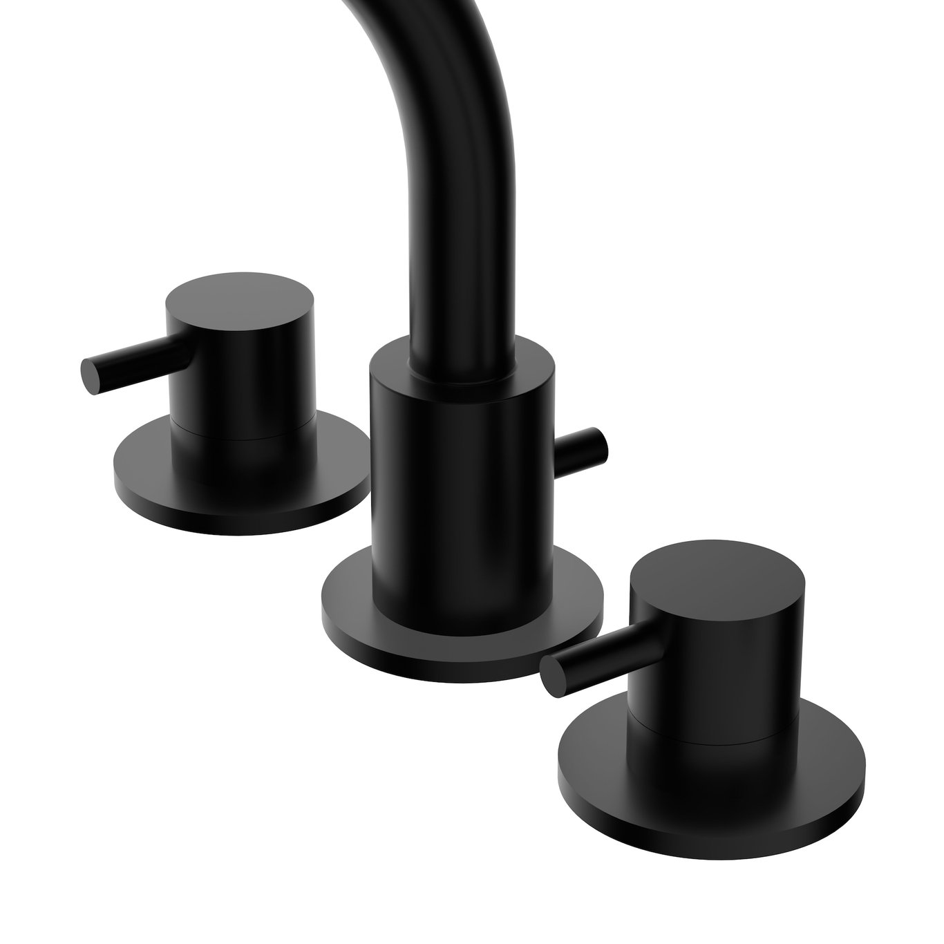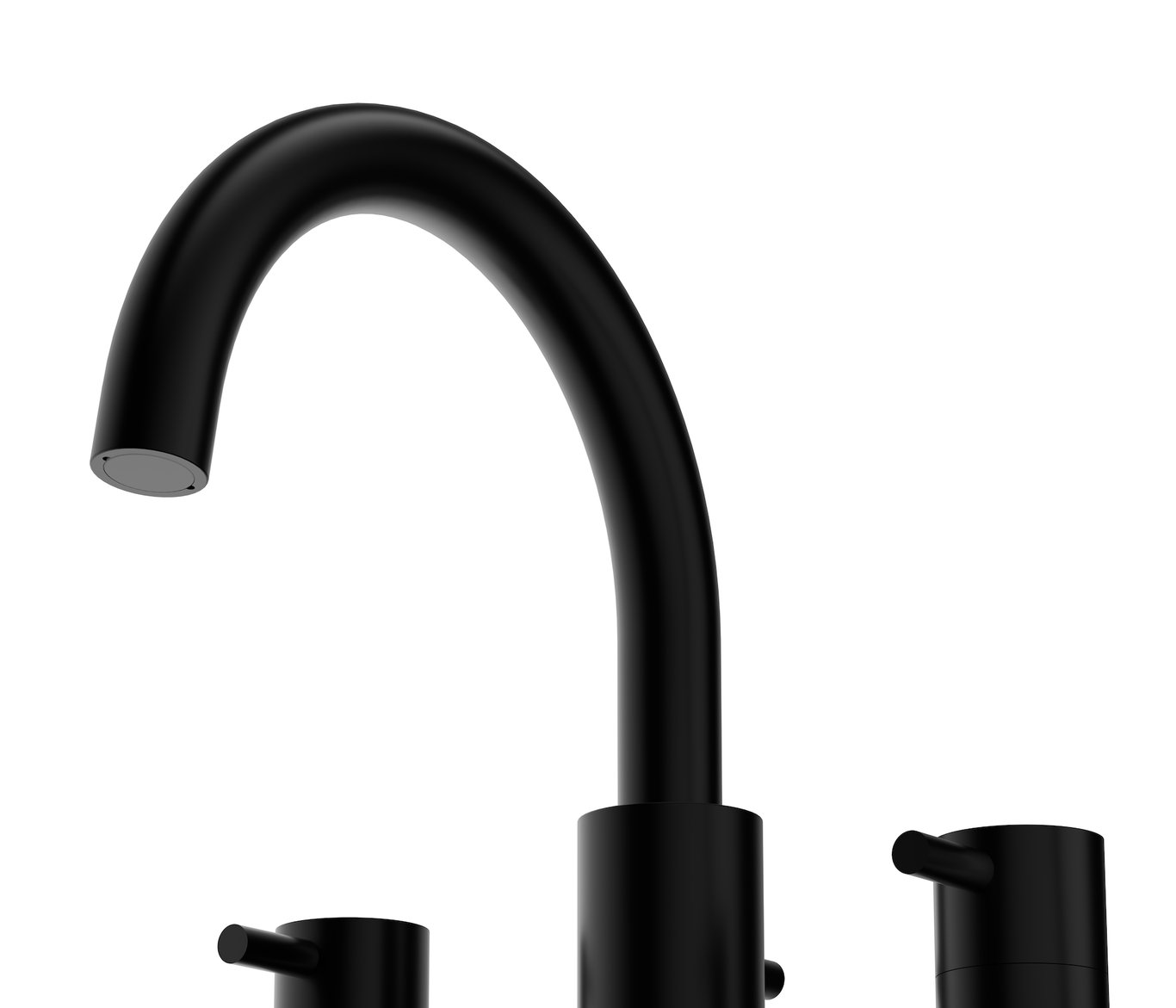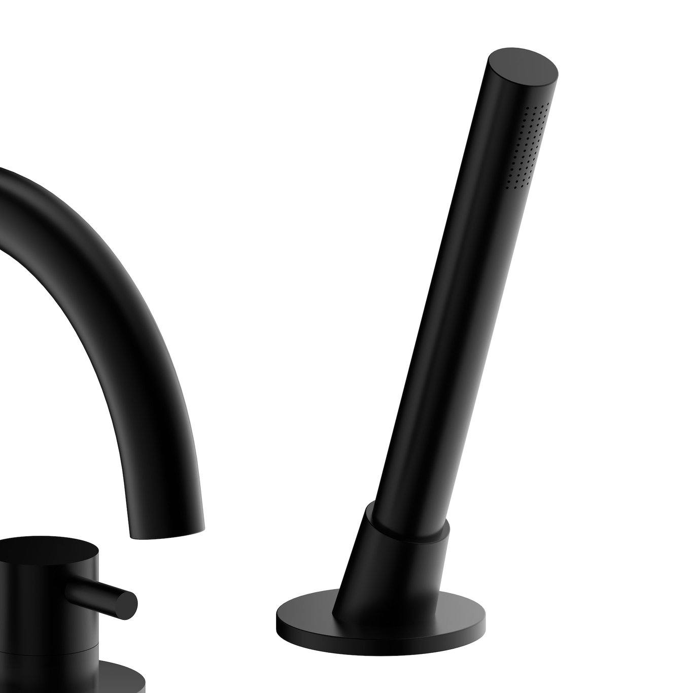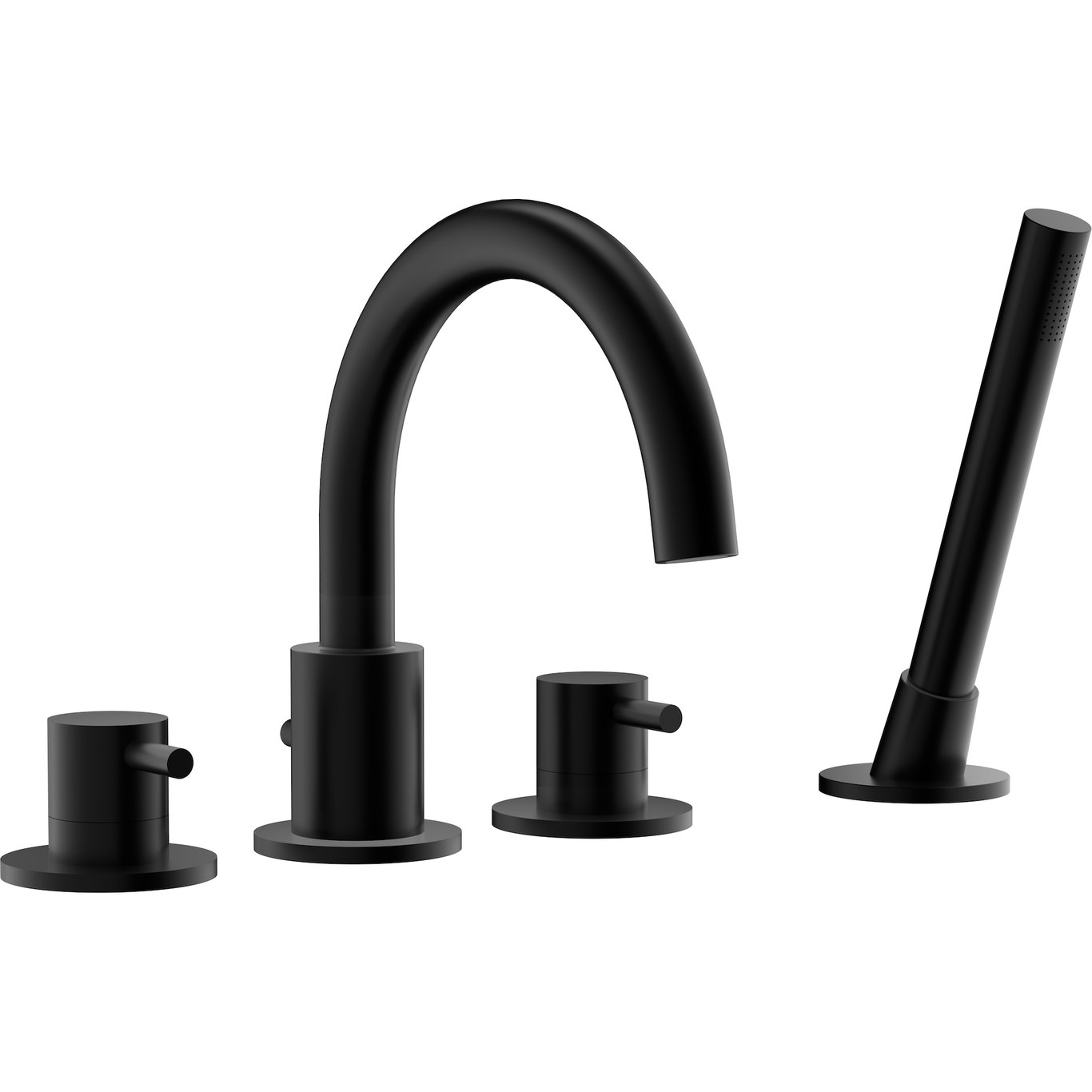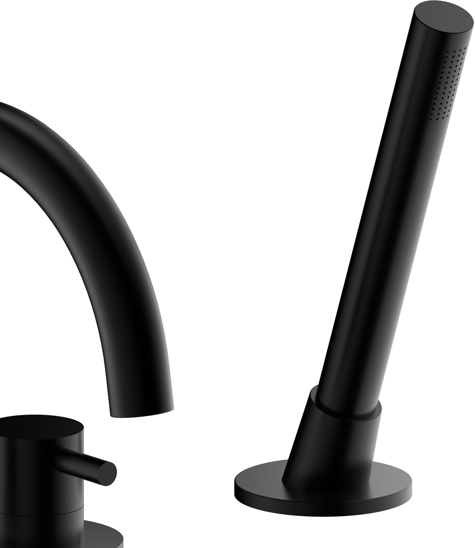 Dette moderne badekararmaturet kommer i matt sort utførelse med et rundt design. Her får du et stilrent armatur som passer perfekt til montering på kanten av badekaret. Med de to hendlene kan du enkelt regulere vannmengde og ønsket temperatur.