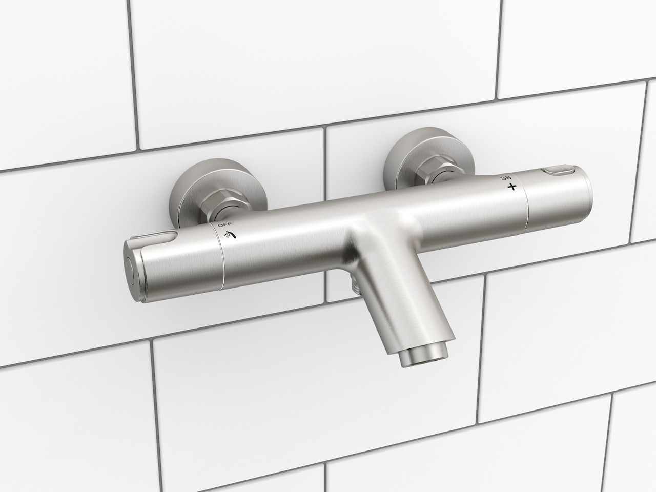 Denne kar- og dusjtermostaten fra Celeste har et minimalistisk design i børstet stål.