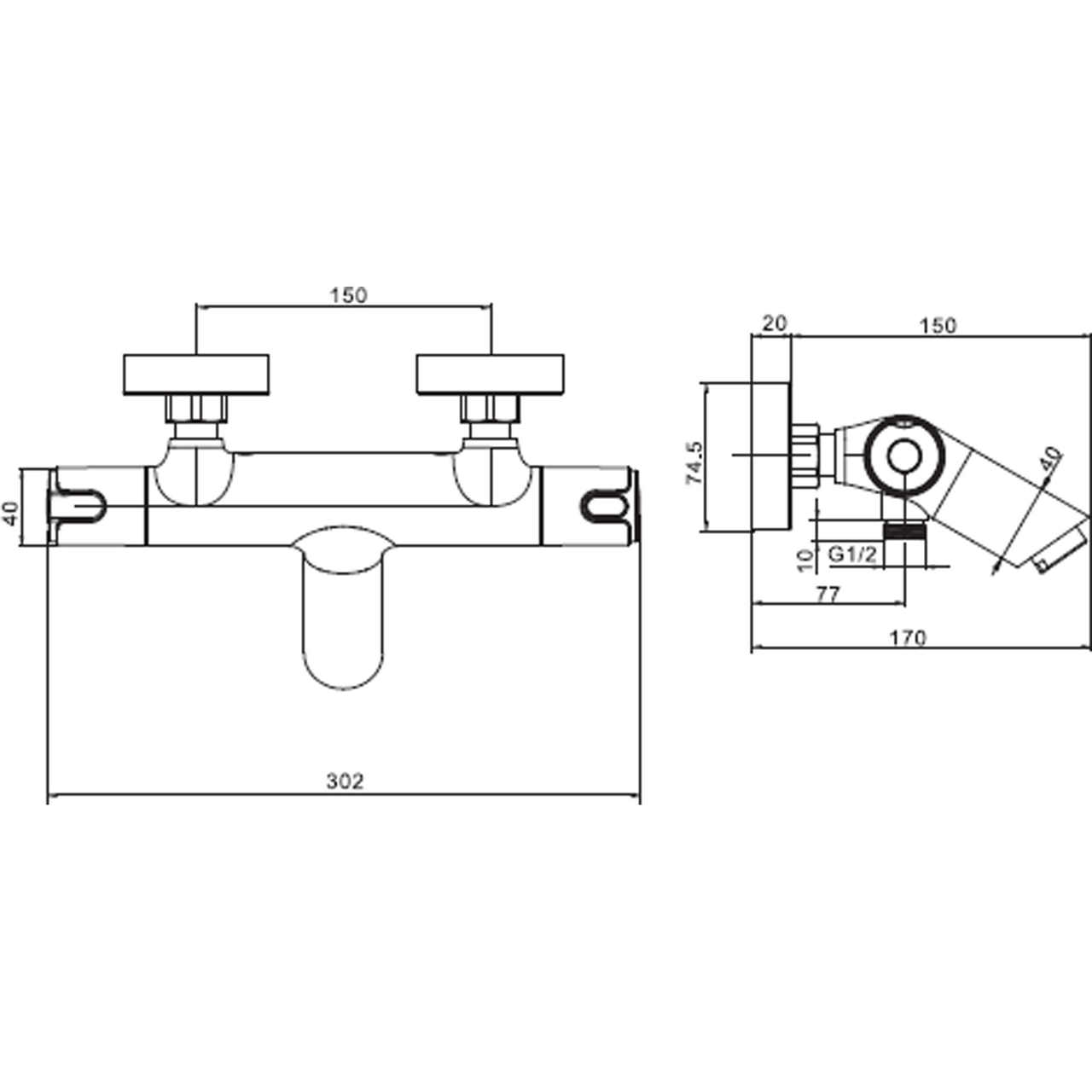 Den har temperaturstyring på høyre side, styring av vannmengde på venstre side, og en sperrefunksjon som minimerer risikoen for skålding. Denne modellen kommer med stussen ned for tilkobling av dusjslange.