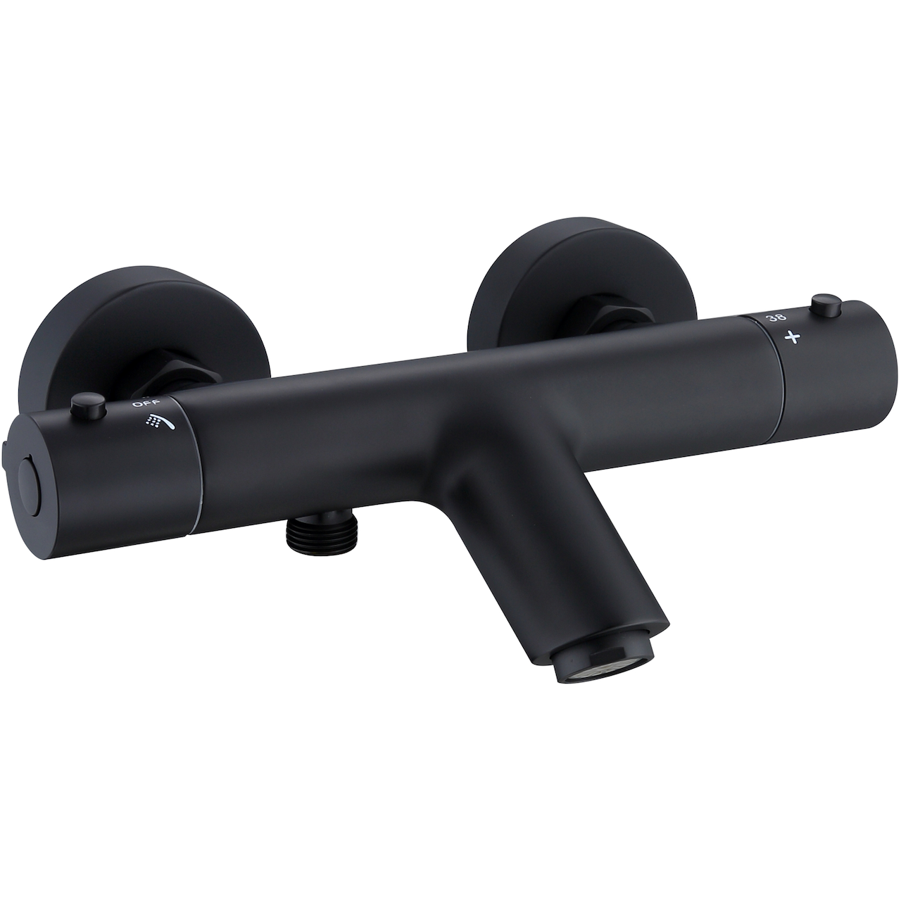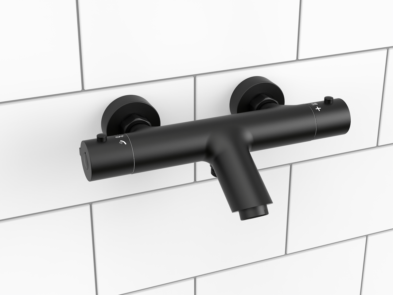 Denne kar- og dusjtermostaten fra Celeste har et moderne design med rene linjer i matt sort.