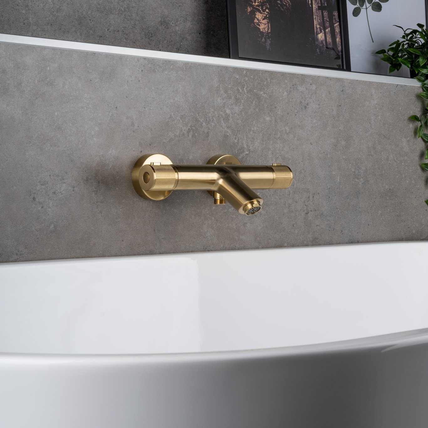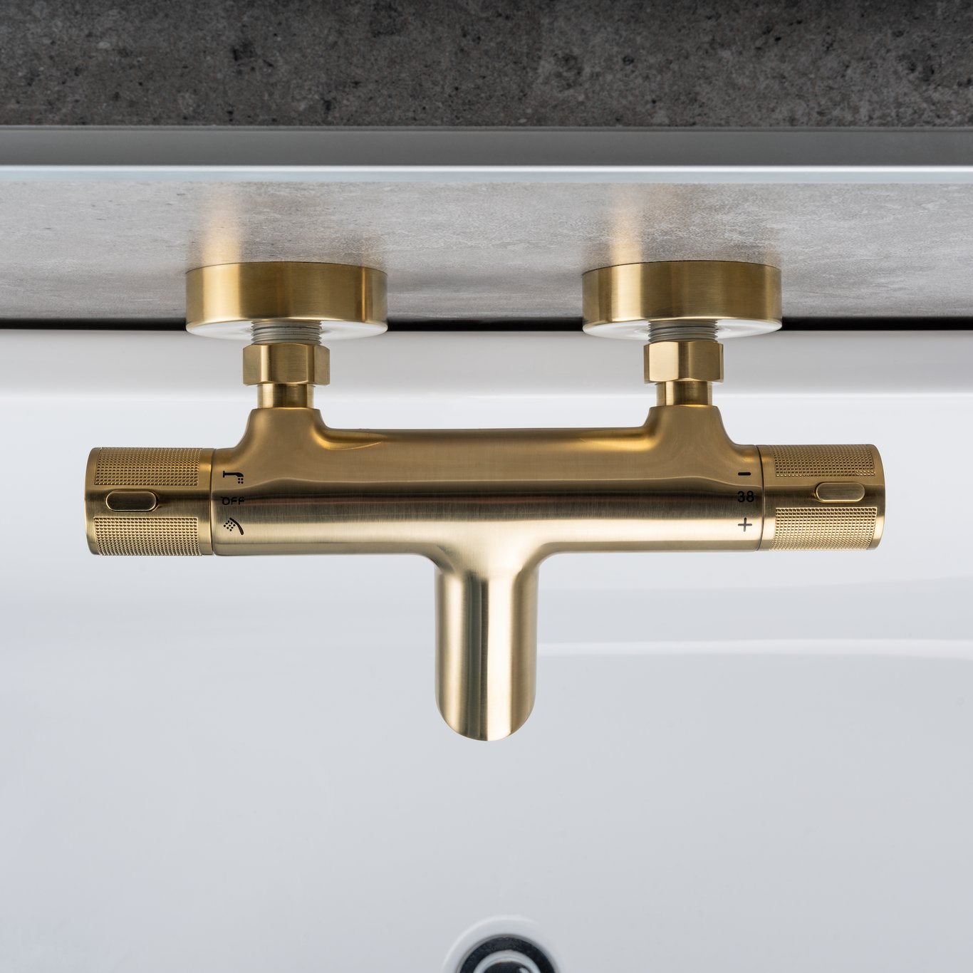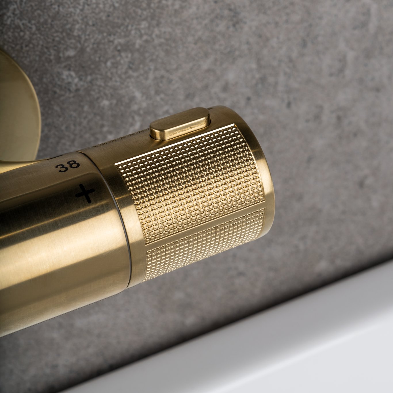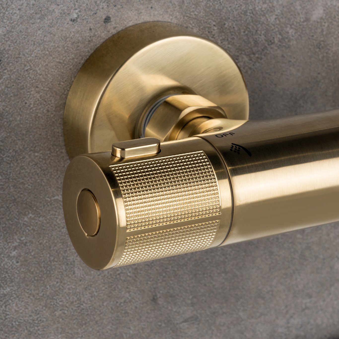 Stoke kar- og dusjtermostat fra Celeste har rene og minimalistiske linjer, med en utførelse av messing.