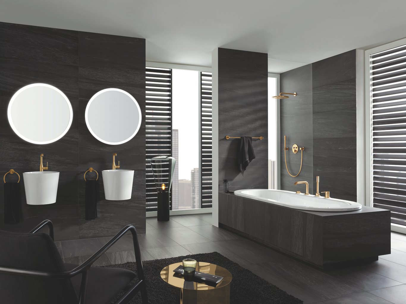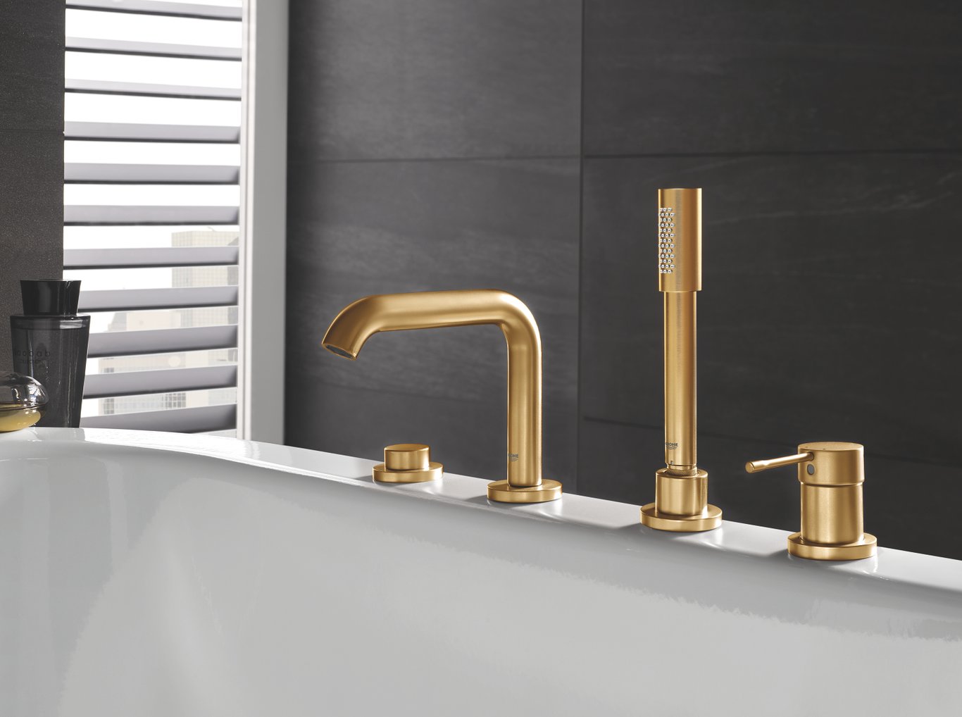 Hvis du går med planer om å lage et nytt baderom, bør du ta en titt på GROHE Essence ettgreps badekarbatteri med hånddusj i børstet Cool Sunrise. Med sin elegante design vil denne firehullskranen virkelig skille seg ut i et stilrent og moderne baderom. Produktet kan monteres med skjult enhet (produktnummer 29037000) og monteres på kanten av badekaret. Settet er fullt av GROHE-teknologi og er ekstremt brukervennlig. Den stilige hånddusjen Euphoria Cosmopolitan Stick, med GROHEs klassiske strålemønster Normal, gjør det enkelt å vaske håret. GROHE watersaving-teknologi begrenser vannforbruket til 9,5 l/min slik at du sparer både vann og penger, og Inner WaterGuide sørger for at overflaten aldri blir for varm. Dette badekarbatteriet er en ettertraktet kombinasjon av form og funksjon. Det passer perfekt sammen med andre produkter fra GROHEs kolleksjon i børstet Cool Sunrise, for eksempel ettgreps badekarbatteriet GROHE Essence, når du vil skape et sømløst baderom.