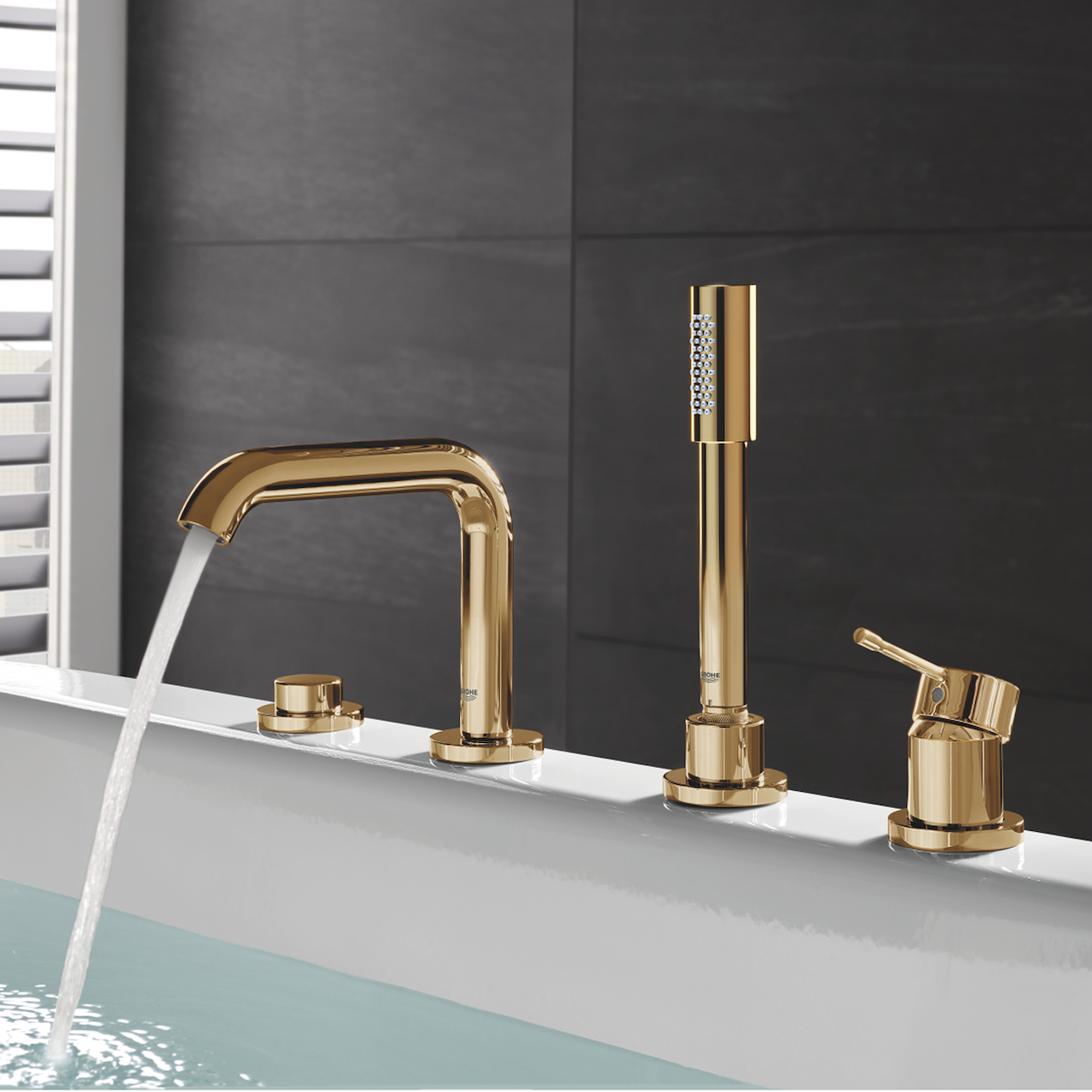 Hvis du går med planer om å lage et nytt baderom, bør du ta en titt på GROHE Essence ettgreps badekarbatteri med hånddusj i Cool Sunrise. Med sin elegante design vil denne firehullskranen virkelig skille seg ut i et stilrent og moderne baderom. Produktet kan monteres med skjult enhet (produktnummer 29037000) og monteres på kanten av badekaret. Settet er fullt av GROHE-teknologi og er ekstremt brukervennlig. Den stilige hånddusjen Euphoria Cosmopolitan Stick, med GROHEs klassiske strålemønster Normal, gjør det enkelt å vaske håret. GROHE watersaving-teknologi begrenser vannforbruket til 9,5 l/min slik at du sparer både vann og penger, og Inner WaterGuide sørger for at overflaten aldri blir for varm. Dette badekarbatteriet er en ettertraktet kombinasjon av form og funksjon. Det passer perfekt sammen med andre produkter fra GROHEs kolleksjon i Cool Sunrise, for eksempel ettgreps badekarbatteriet GROHE Essence, når du vil skape et sømløst baderom.