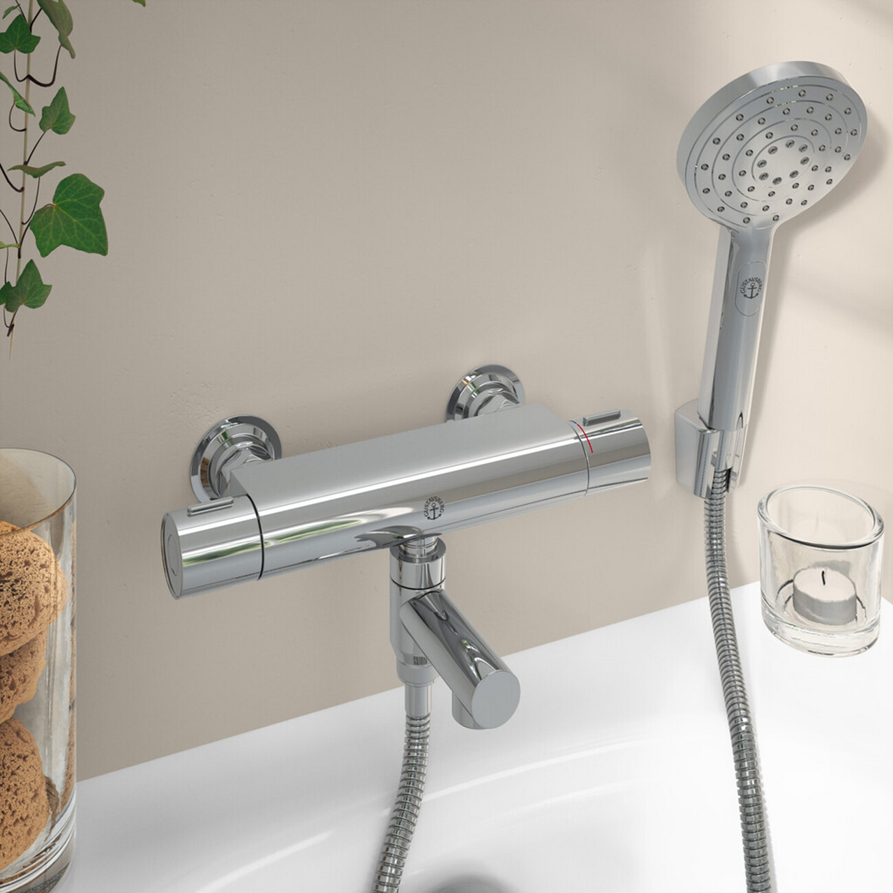 Badekarbatteriet har en knott med tydelig fargemerking for varmt og kaldt vann, samt en integrert automatisk varmtvannssperre for beskyttelse mot skålding. Safe Touch-teknologien minimerer varmen på forsiden av blandebatteriet, og systemet reagerer raskt på trykk- og temperaturendringer i vannstrømmen, noe som gir en jevn vanntemperatur.