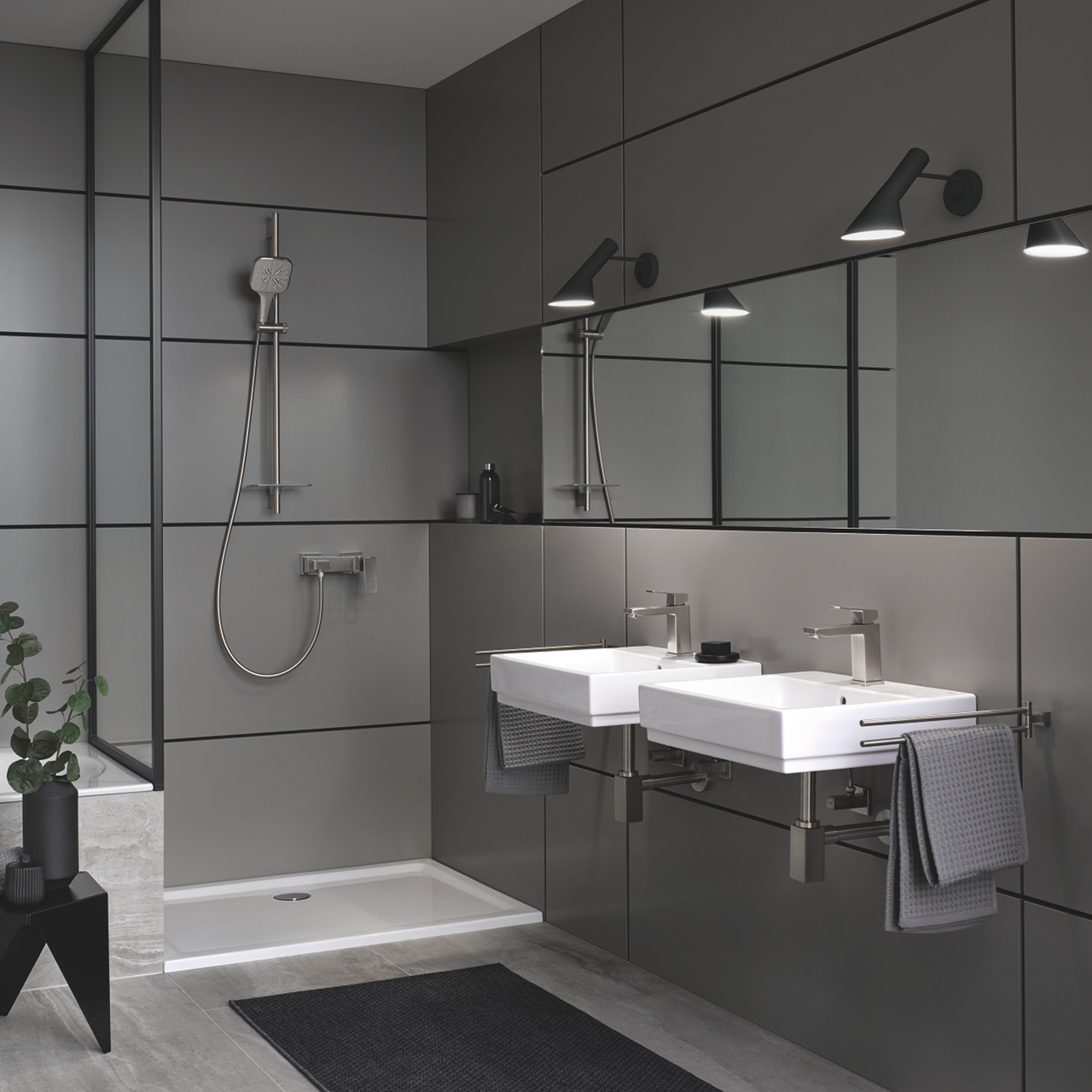 Eurocube dusjbatteri fra Grohe har en slitesterk overflate som er enkel å rengjøre. Det stilrene designet passer godt inn på ethvert baderom.