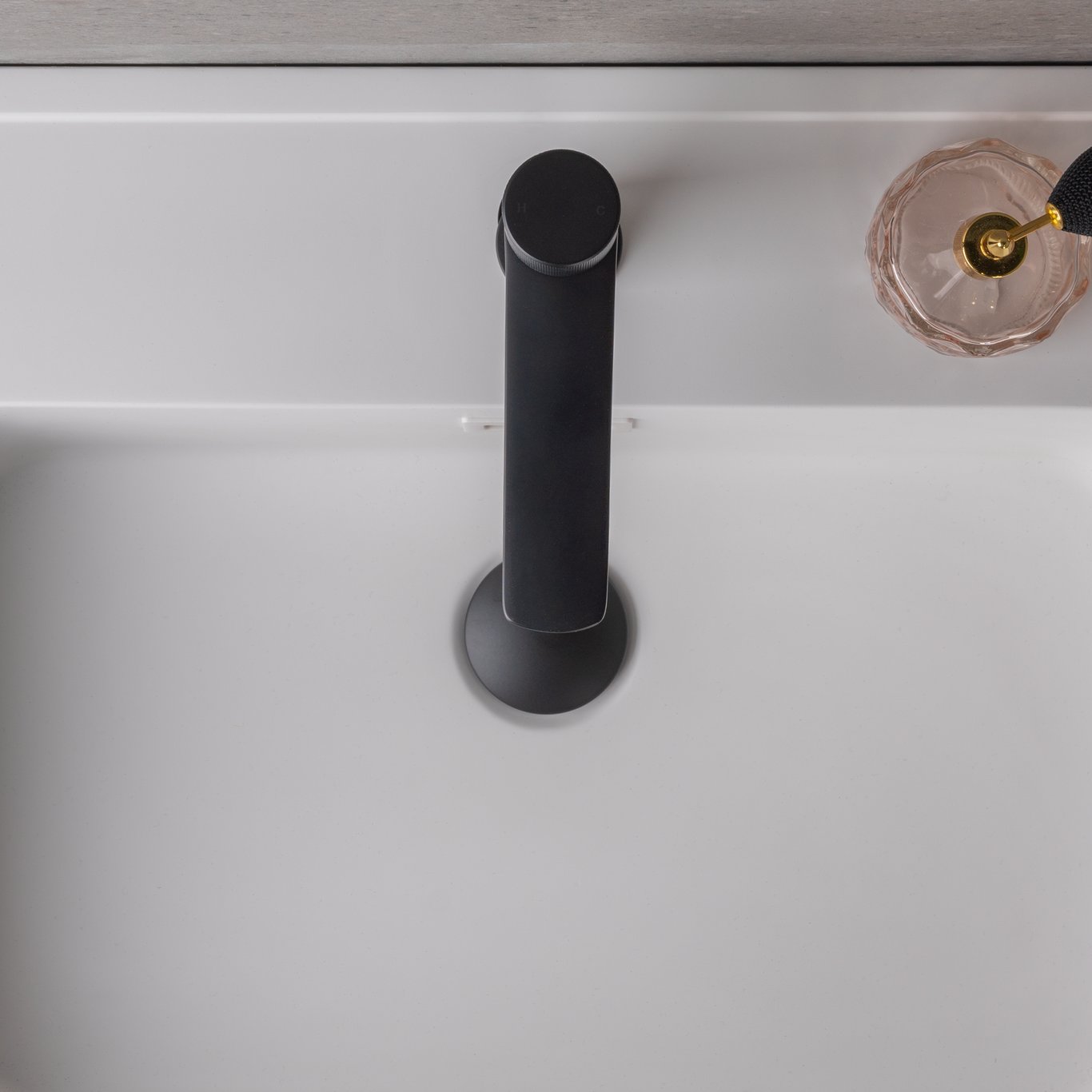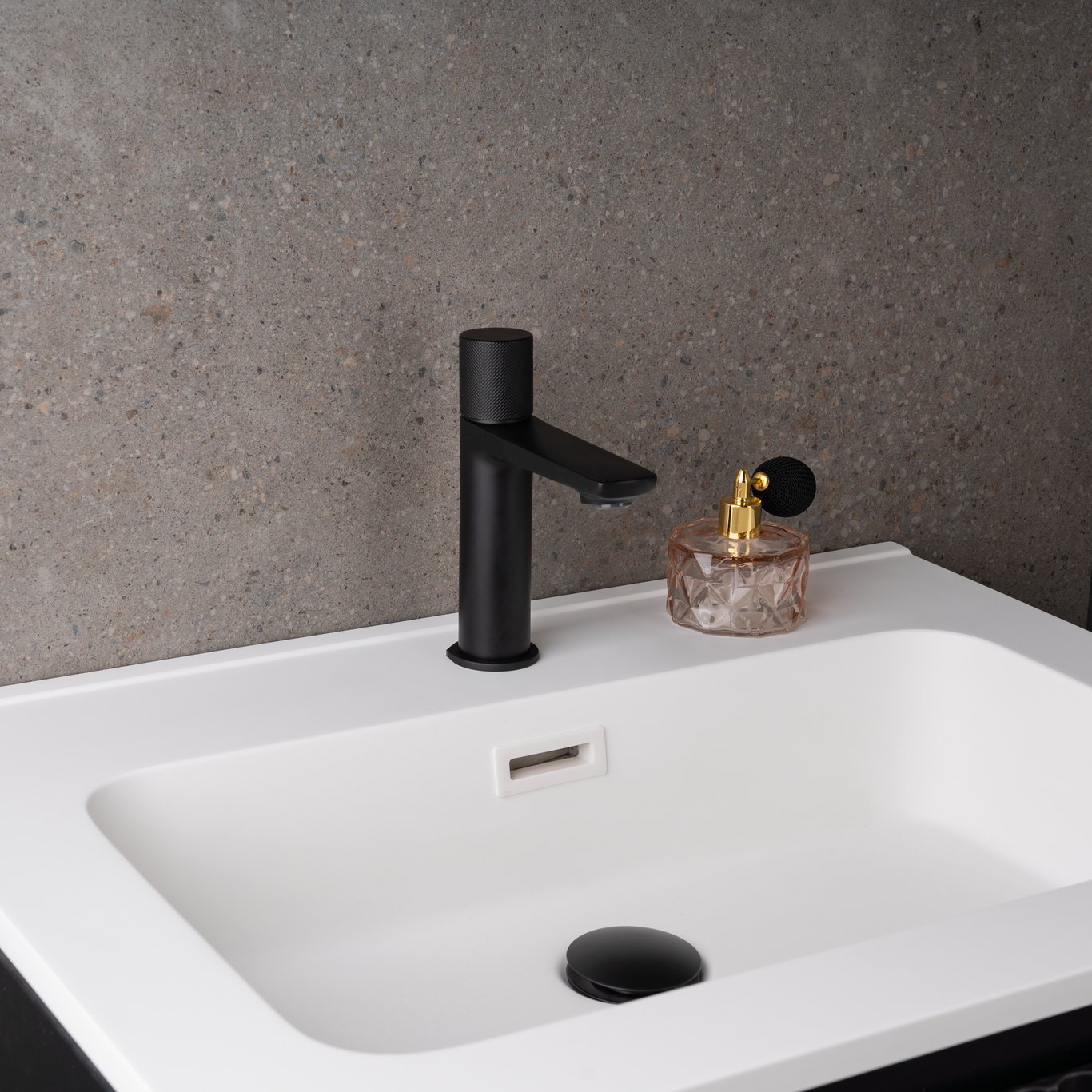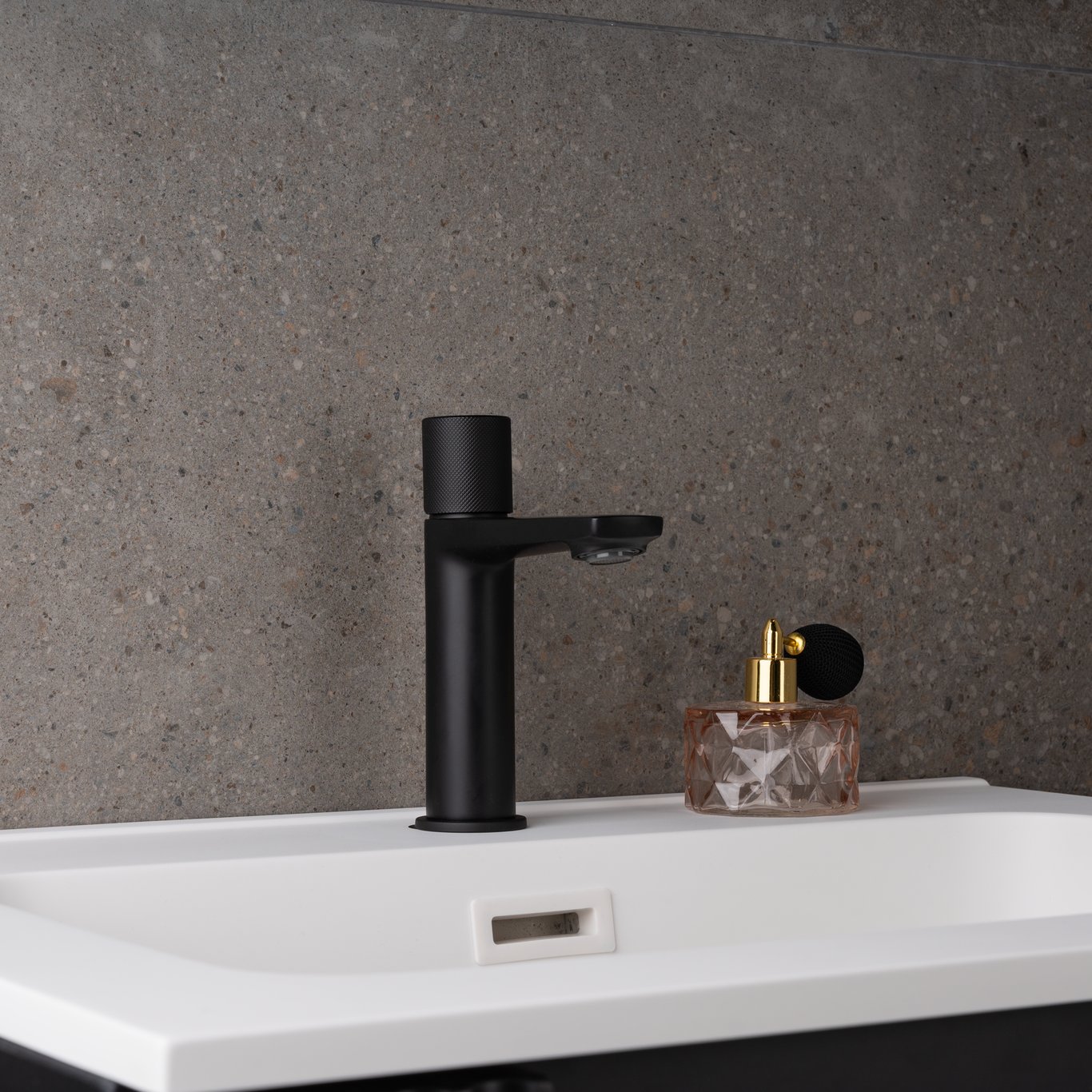 Dette moderne servantbatteriet fra Celeste har et stilrent design, og en overflate i matt sort. For å justere vannmengden vipper du toppen bakover, og for å justere temperaturen vrir du til høyre eller venstre.