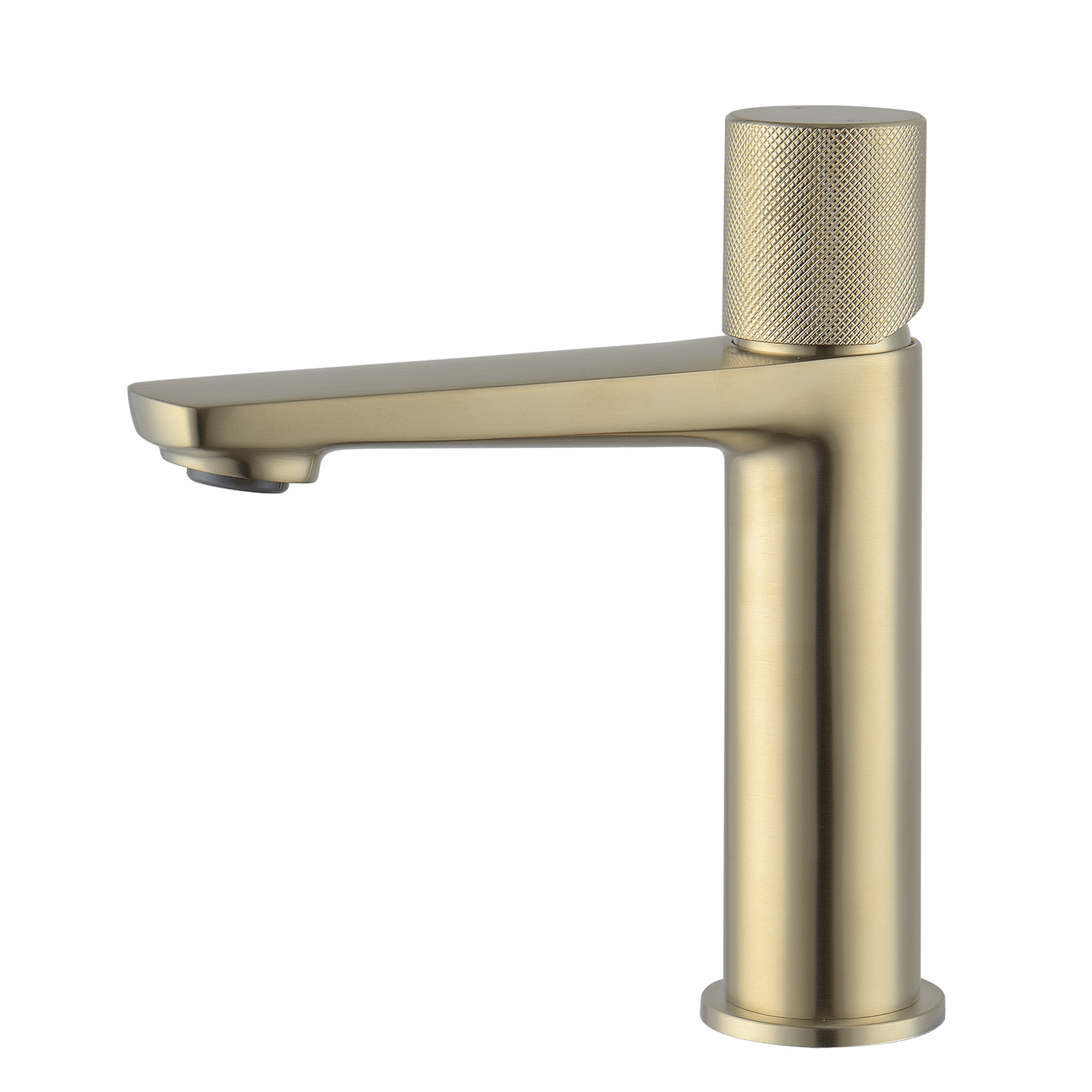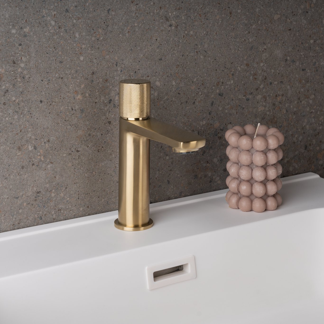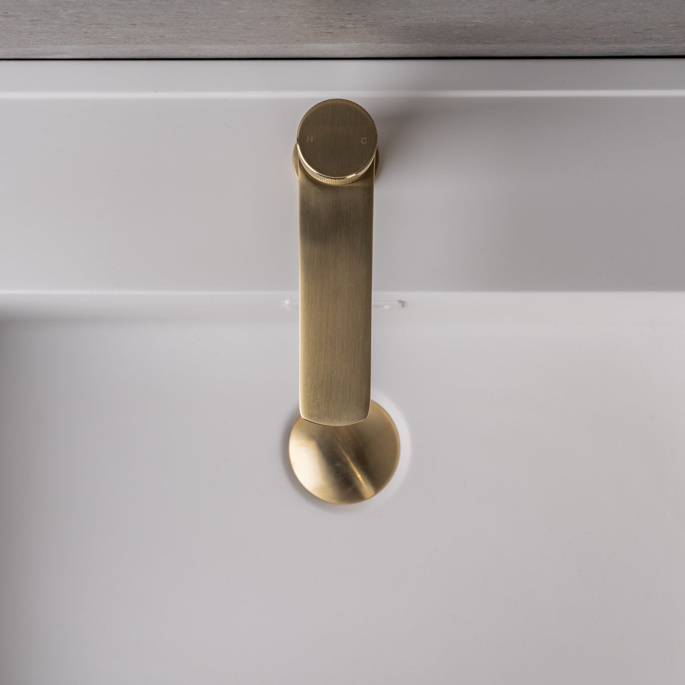 Dette moderne servantbatteriet fra Celeste har et stilrent design, og en overflate i messing. For å justere vannmengden vipper du toppen bakover, og for å justere temperaturen vrir du til høyre eller venstre.