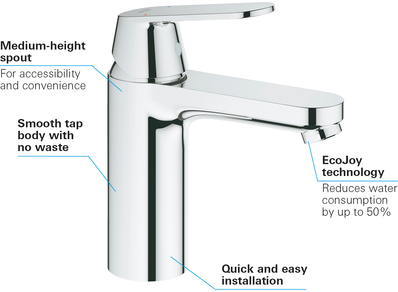 Enkelt installasjonssystem – gjør det enkelt å installere kranenMiddels høy tut er praktisk og gir god tilgjengelighetGROHE watersaving® – sparer vann og penger
