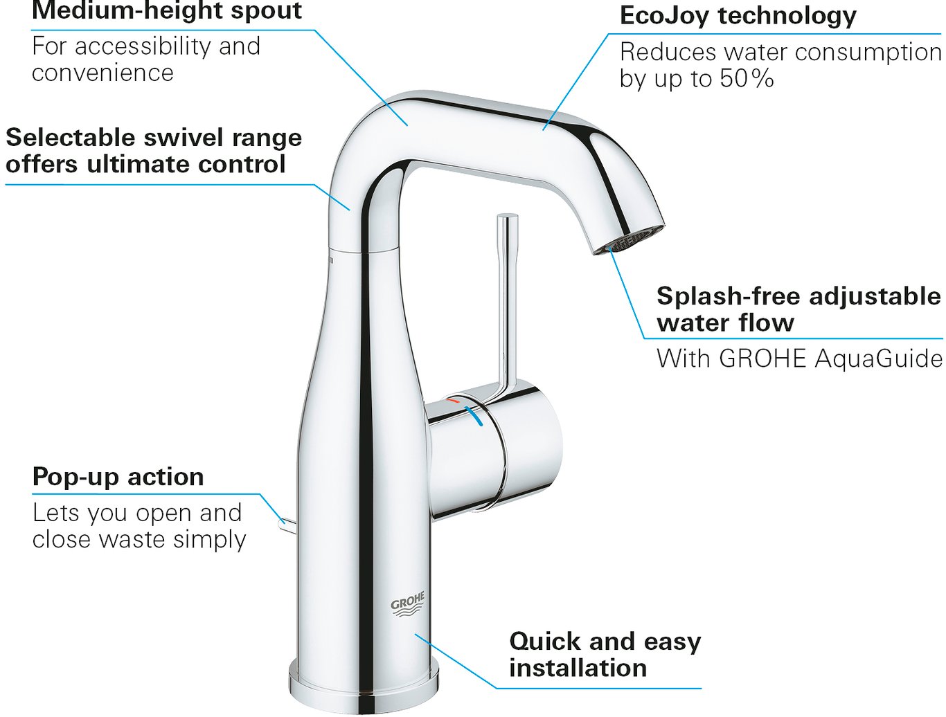 Denne baderomskranen fra GROHE Essence-kolleksjonen er designet med middels høy tut som gjør det enkelt å fylle store beholdere. Den svingbare tuten gir optimal brukervennlighet. Det er enkelt å aktivere avløpsgarnityren takket være den innebygde oppløftsventilen. GROHE SilkMove-patronen gjør det enkelt å justere vannmengde og temperatur. GROHE watersaving-vannbegrenseren begrenser vannforbruket til 6,6 liter i minuttet, selv når kranen er helt åpen. Monteringen går raskt og problemfritt takket være GROHE QuickFix Plus-systemet. Det har GROHE StarLight kromfinish som blir et naturlig og skinnende blankt midtpunkt på baderommet.