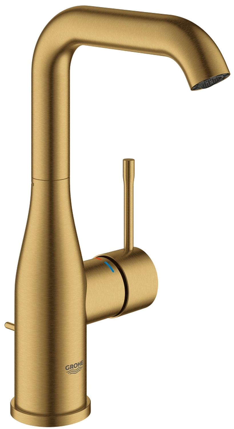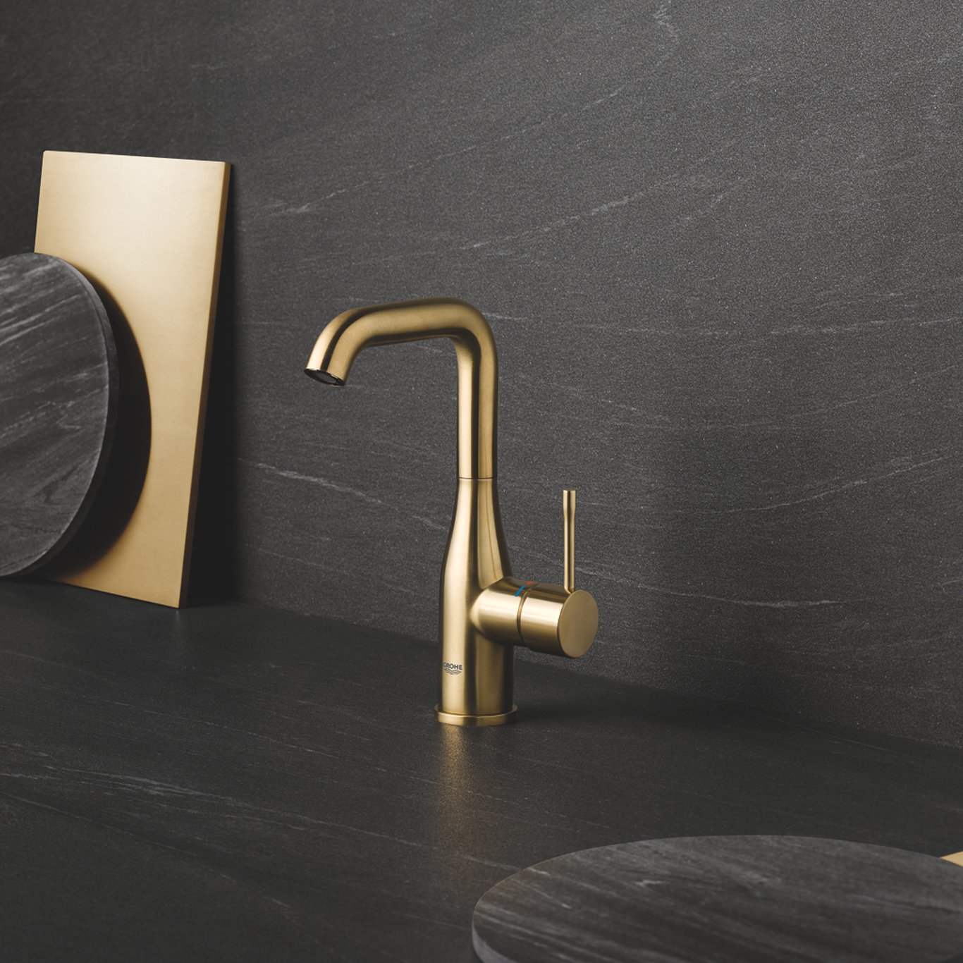 Ettgreps servantbatteriet GROHE Essence har unik buet og høy tut i børstet Cool Sunrise med oppløftsventil og avløpsgarnityr. Det passer perfekt på alle stilrene og moderne baderom. Den er full av GROHE-teknologi og ekstremt brukervennlig. GROHE SilkMove keramisk patron gjør det enkelt å justere både vannmengde og temperatur. GROHE watersaving-teknologi begrenser vannforbruket til 5,7 l/min slik at du sparer både vann og penger. Den har til og med justerbar svingradius slik at du får total kontroll. Du kan låse fast tuten, begrense svingradiusen til 150 grader eller velge full fleksibilitet ved å la den svinge 360 grader. Du kan til og med stille inn vinkelen på AquaGuide-strålesamleren slik at den passer servanten. På den måten unngår du søl og sprut. GROHE QuickFix Plus-systemet reduserer monteringstiden for etthullsinstallasjonen med inntil 50 %! Dette monoblokkbatteriet er en ettertraktet kombinasjon av form og funksjon. Det passer perfekt sammen med andre produkter fra GROHE Essence-kolleksjonen i børstet Cool Sunrise når du vil skape et sømløst baderom.