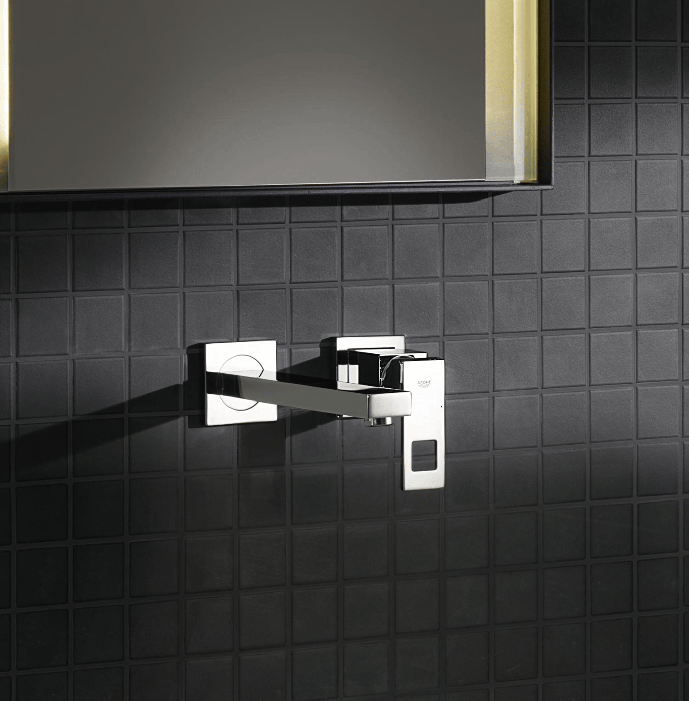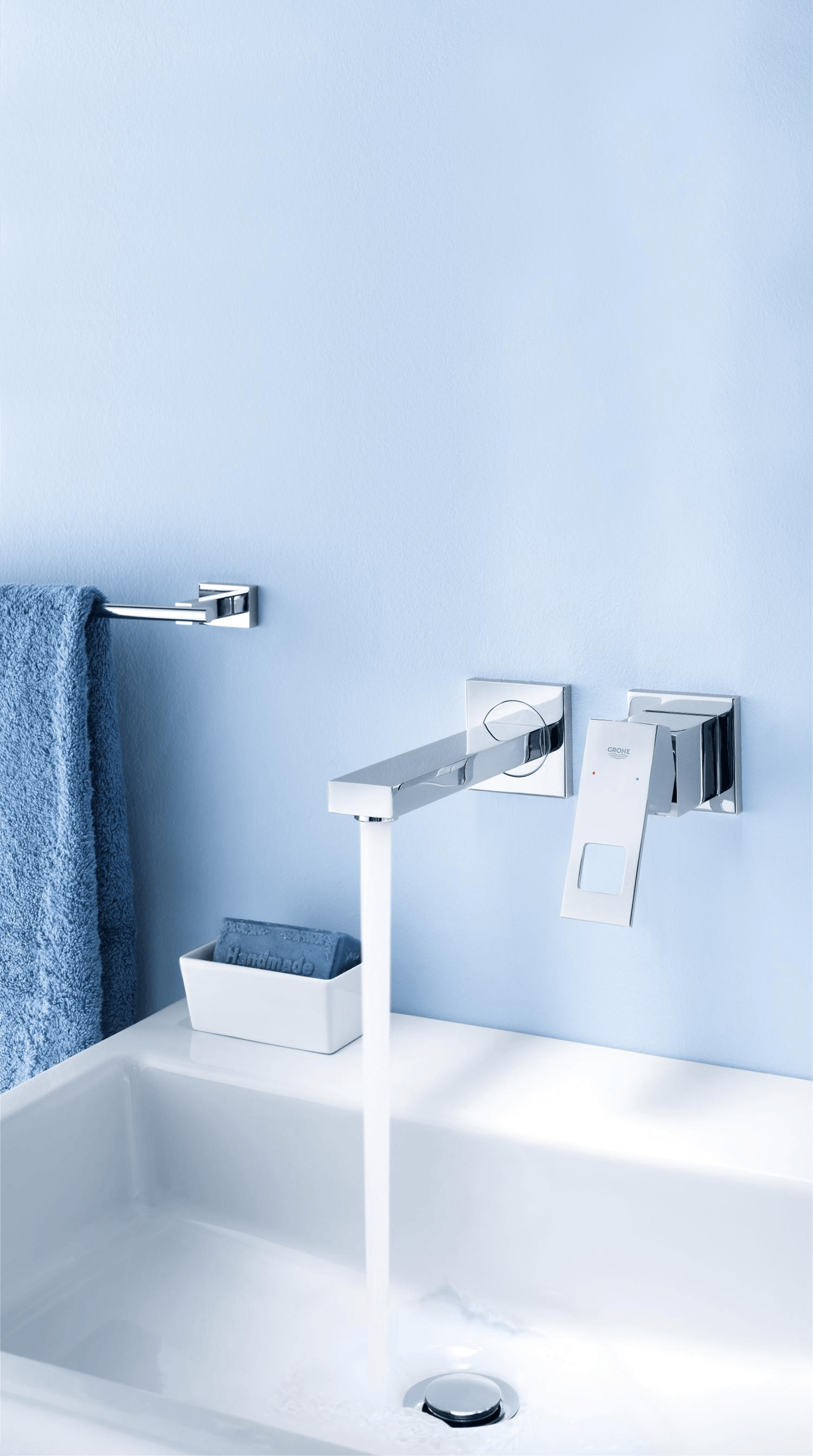Dette servantbatteriet fra Grohe har et elegant design, med rette linjer og en overflate i krom. Den veggmonterte kranen gir sammen med en frittstående servant en moderne helhet på badet.